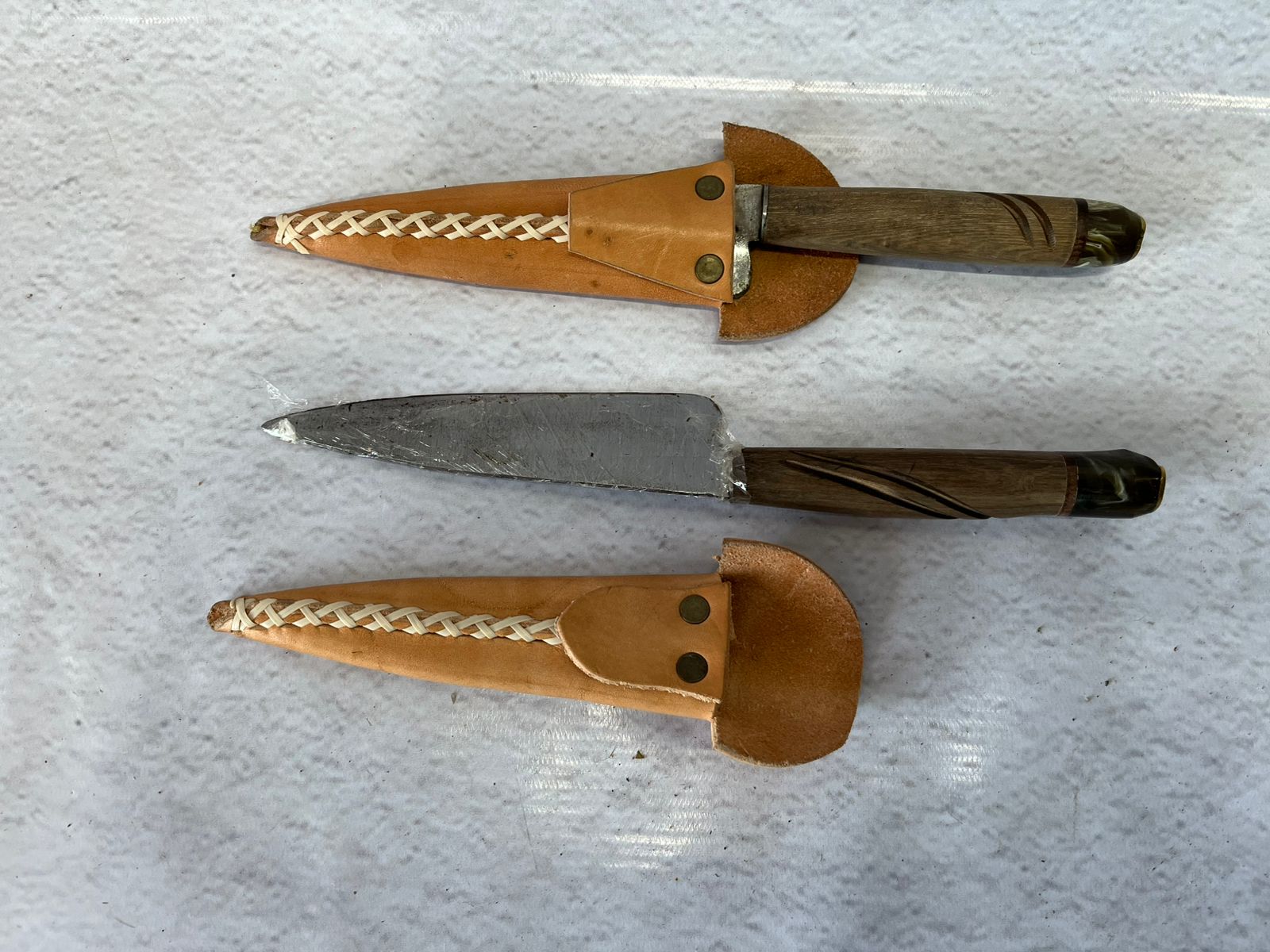 Cuchillo campero artesanal con hoja de disco de arado de 14cm, vaina de cuero y puntera de bronce. Ideal para actividades al aire libre y coleccionismo.