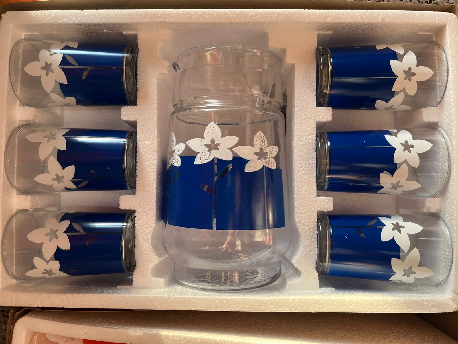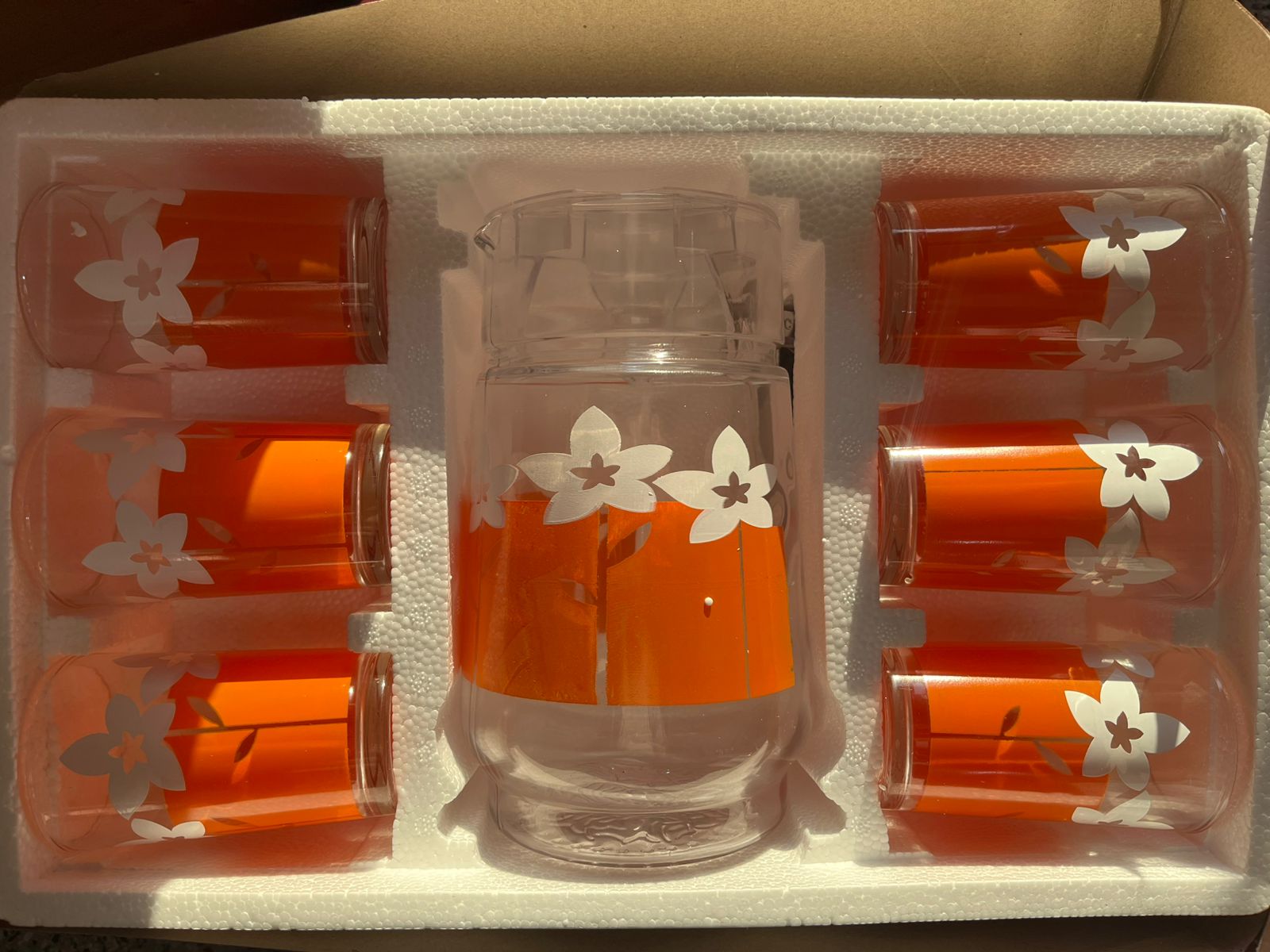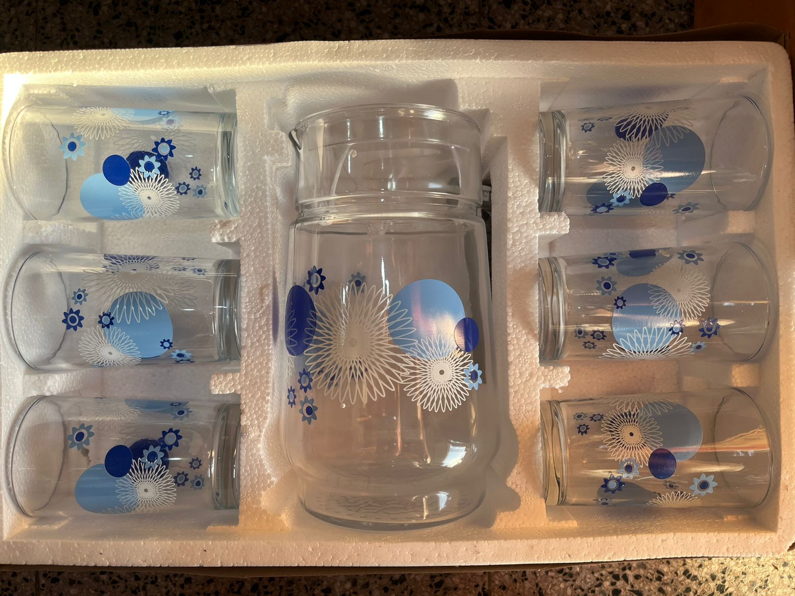 Elegante set de jarra de vidrio y 6 vasos, perfecto para servir bebidas con estilo. Ideal para agua, zumos o cócteles en cualquier ocasión. Diseño duradero y fácil de limpiar, realza tu mesa. Imprescindible en tu hogar para el día a día o eventos especiales. Añade un toque sofisticado a tu menaje.