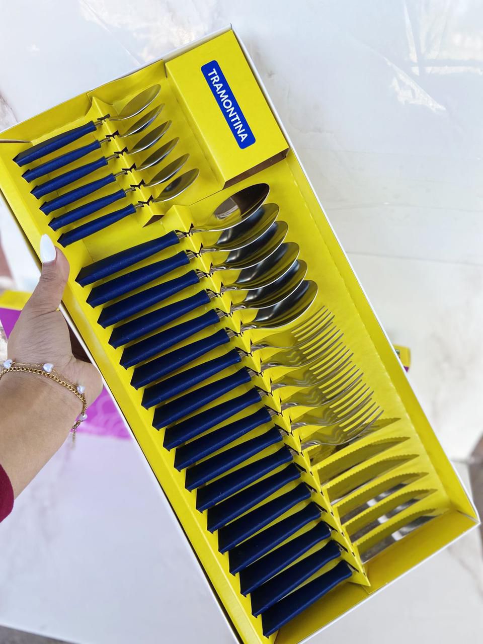 Juego de cubiertos Tramontina de 30 piezas: 6 cuchillos, 6 tenedores, 6 cucharas, 6 cucharitas y 6 tenedores de postre. Ideal para uso diario y ocasiones especiales, combina durabilidad y estilo. ¡Optimiza tu mesa!