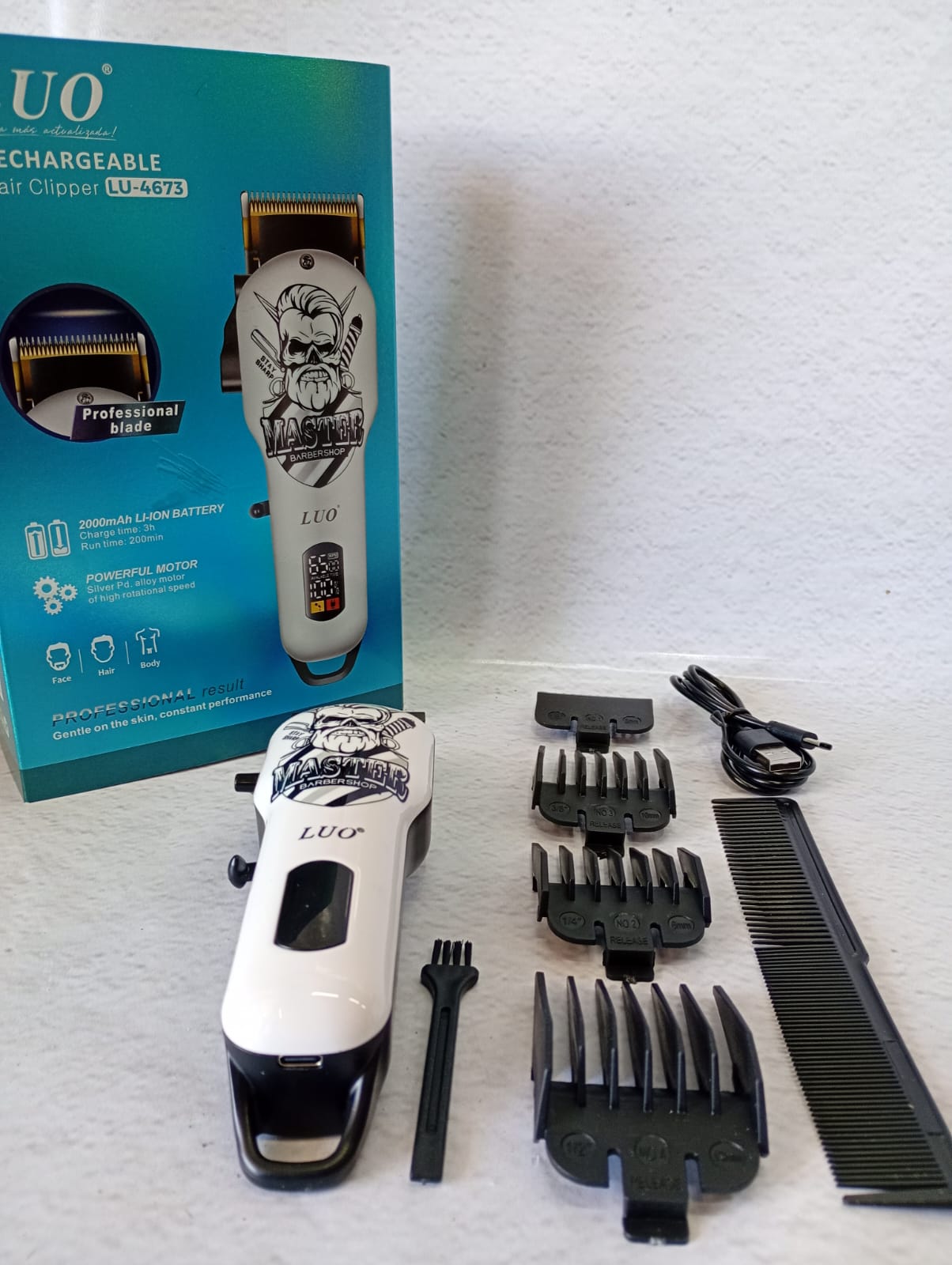 Máquina cortapelo inalámbrica recargable con accesorios. Ideal para cortes precisos en casa. Diseño ergonómico y fácil de usar.