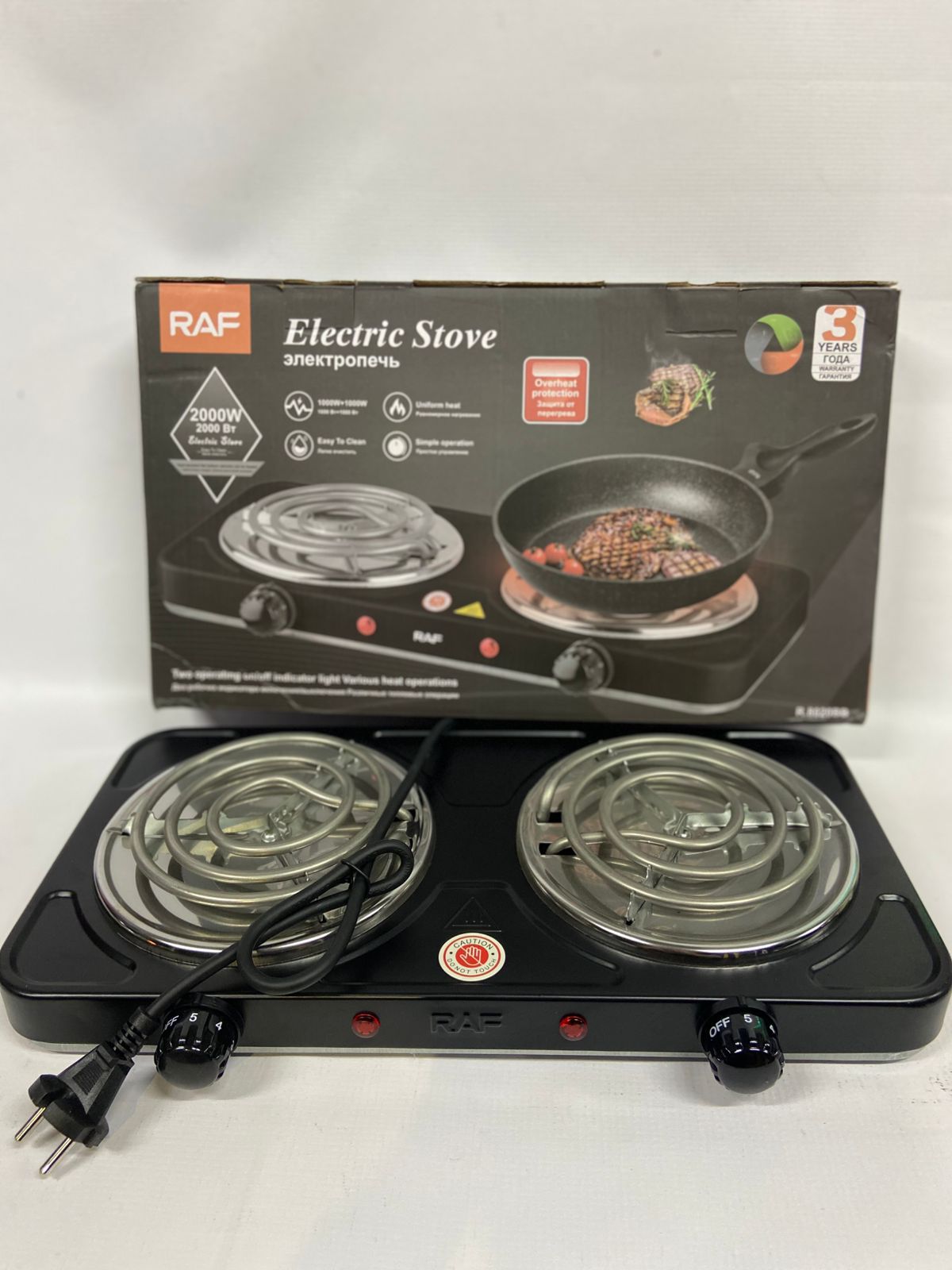 Anafe eléctrico RAF de 2 hornallas con interruptor con luz indicadora. Ideal para cocinas pequeñas, departamentos o como cocina auxiliar. Práctico y eficiente.