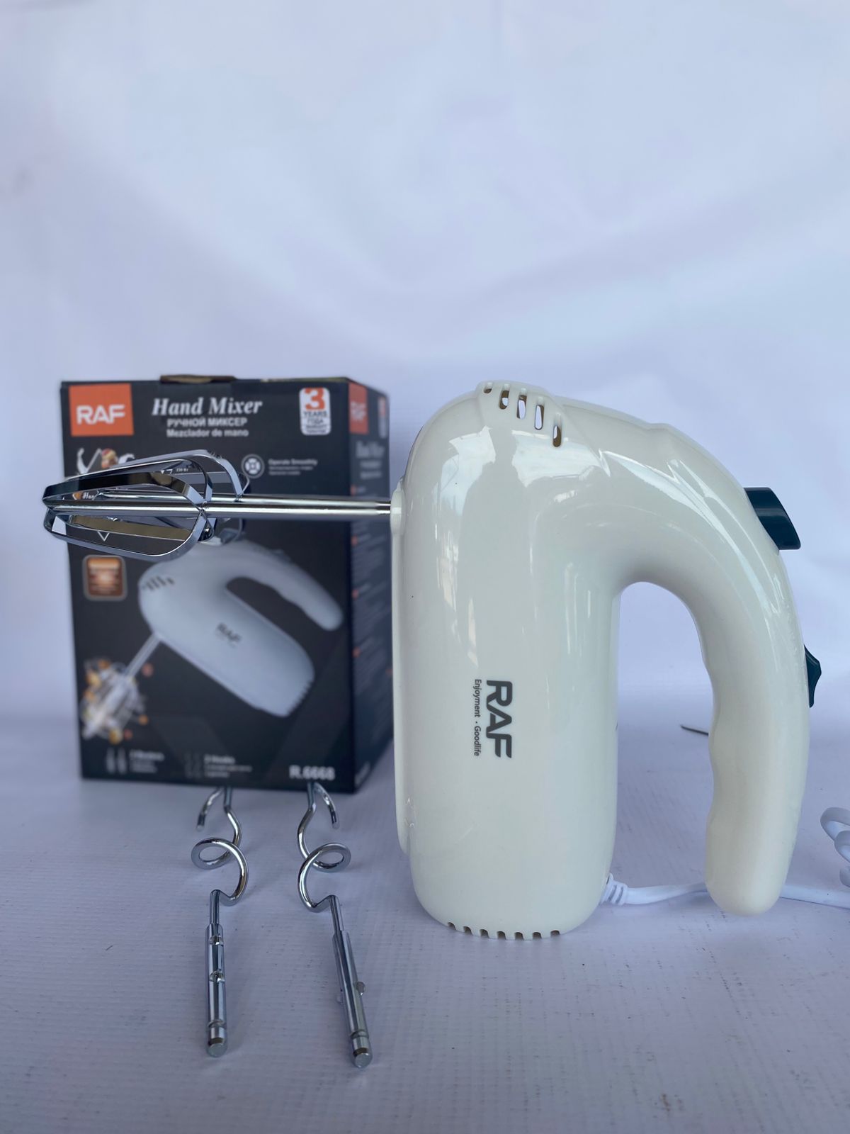 Batidora de mano RAF de 230W con 5 velocidades y 4 accesorios para batir. Perfecta para preparar salsas, batidos y masas de forma rápida y eficiente en tu cocina.
