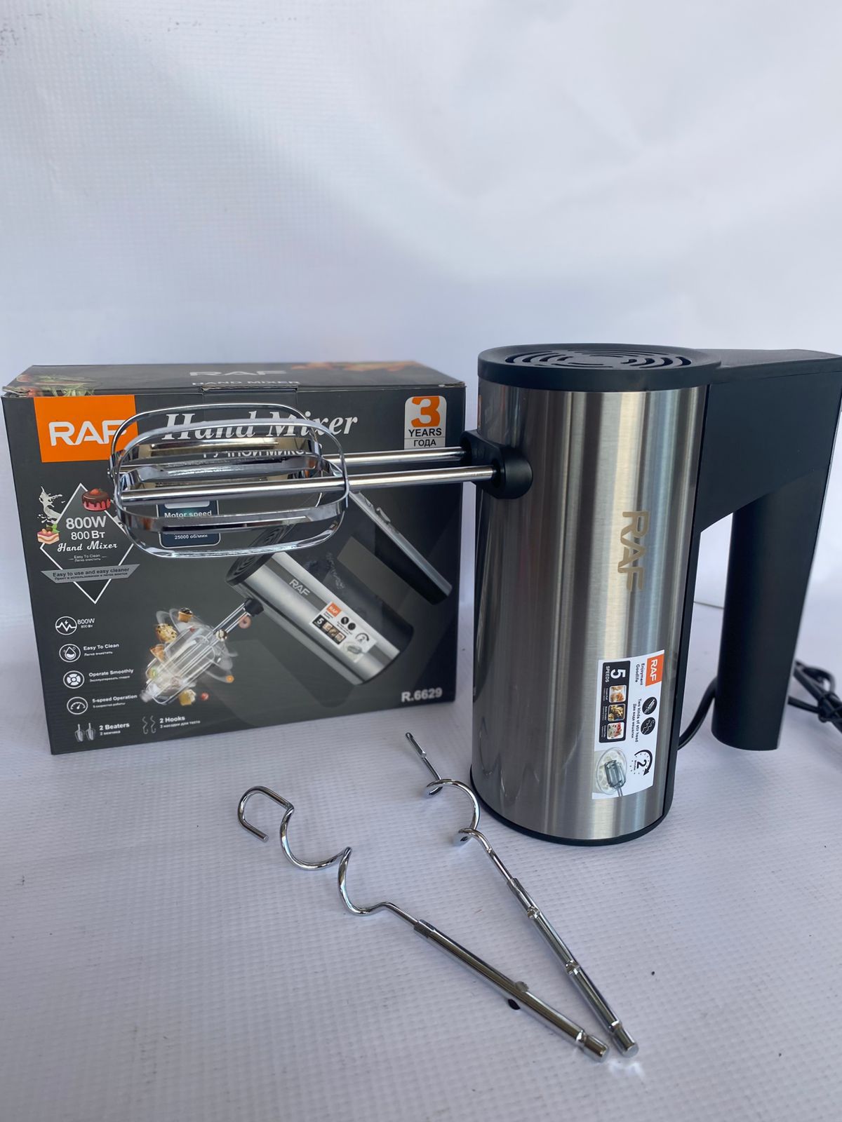 Batidora eléctrica RAF de 800W con 5 velocidades y 4 accesorios de acero inoxidable. Potente y fácil de usar para preparar tus recetas favoritas.