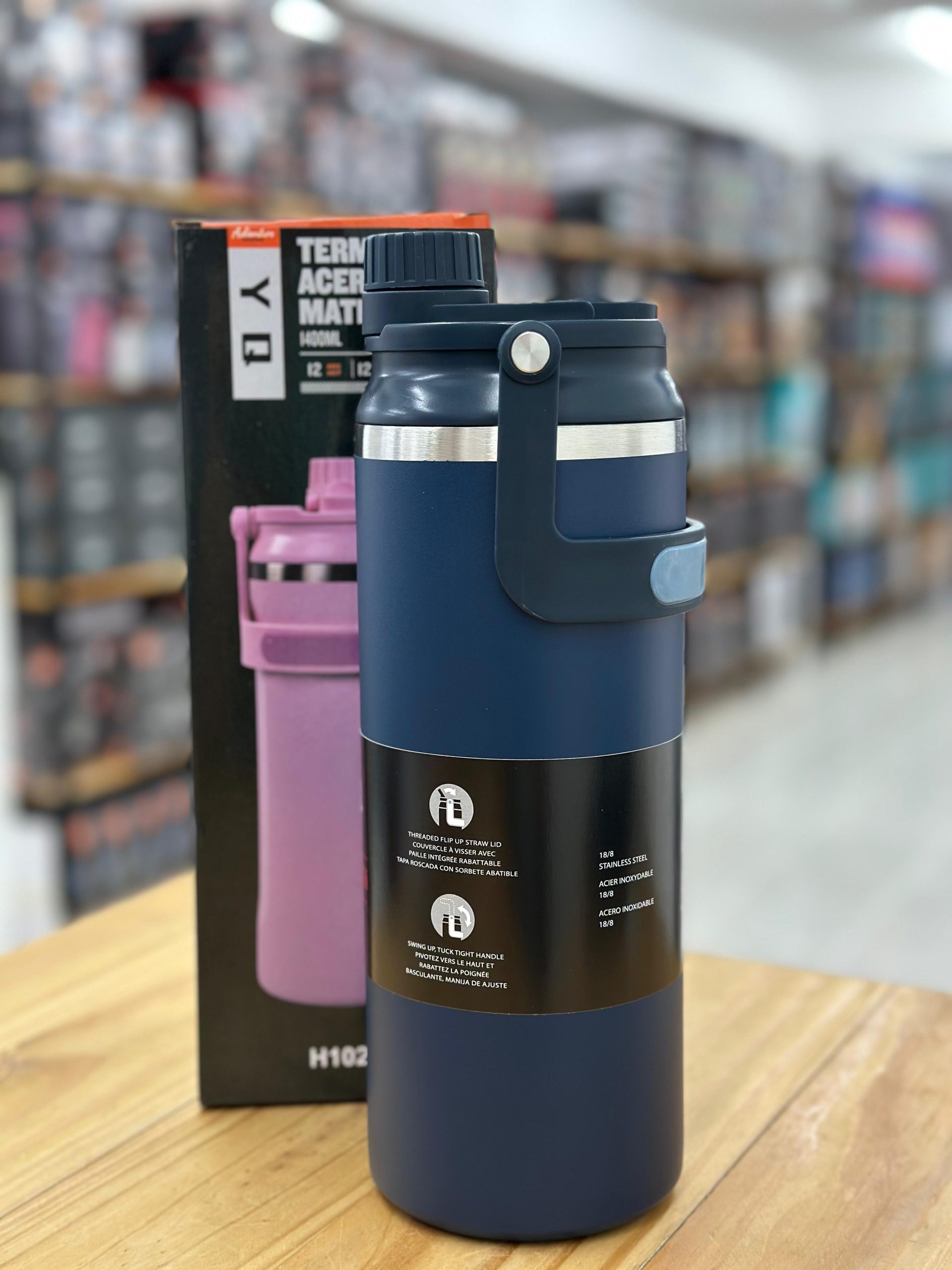 Botella de agua reutilizable de 1.4 litros, ideal para deporte, gimnasio o el día a día. Fabricada en plástico resistente y libre de BPA. Oferta por reingreso de stock.