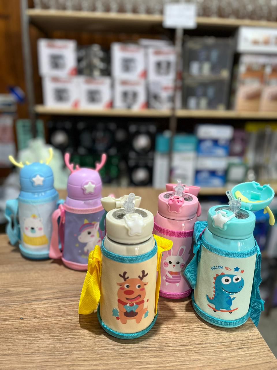 Botella infantil Hoppy de acero inoxidable con pico de goma suave y correa. Diseño animado, ideal para bebés y niños. Mantiene líquidos fríos o calientes, libre de BPA y fácil de transportar.