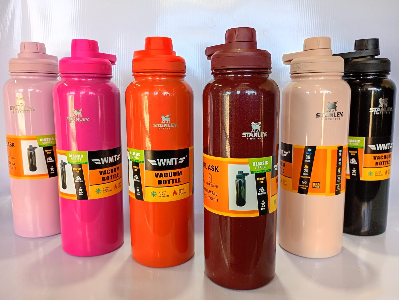 Botella Stanley de acero inoxidable con efecto glitter, ideal para mantener bebidas frías o calientes por horas. Capacidad de 1.2L, diseño duradero y estilo brillante.