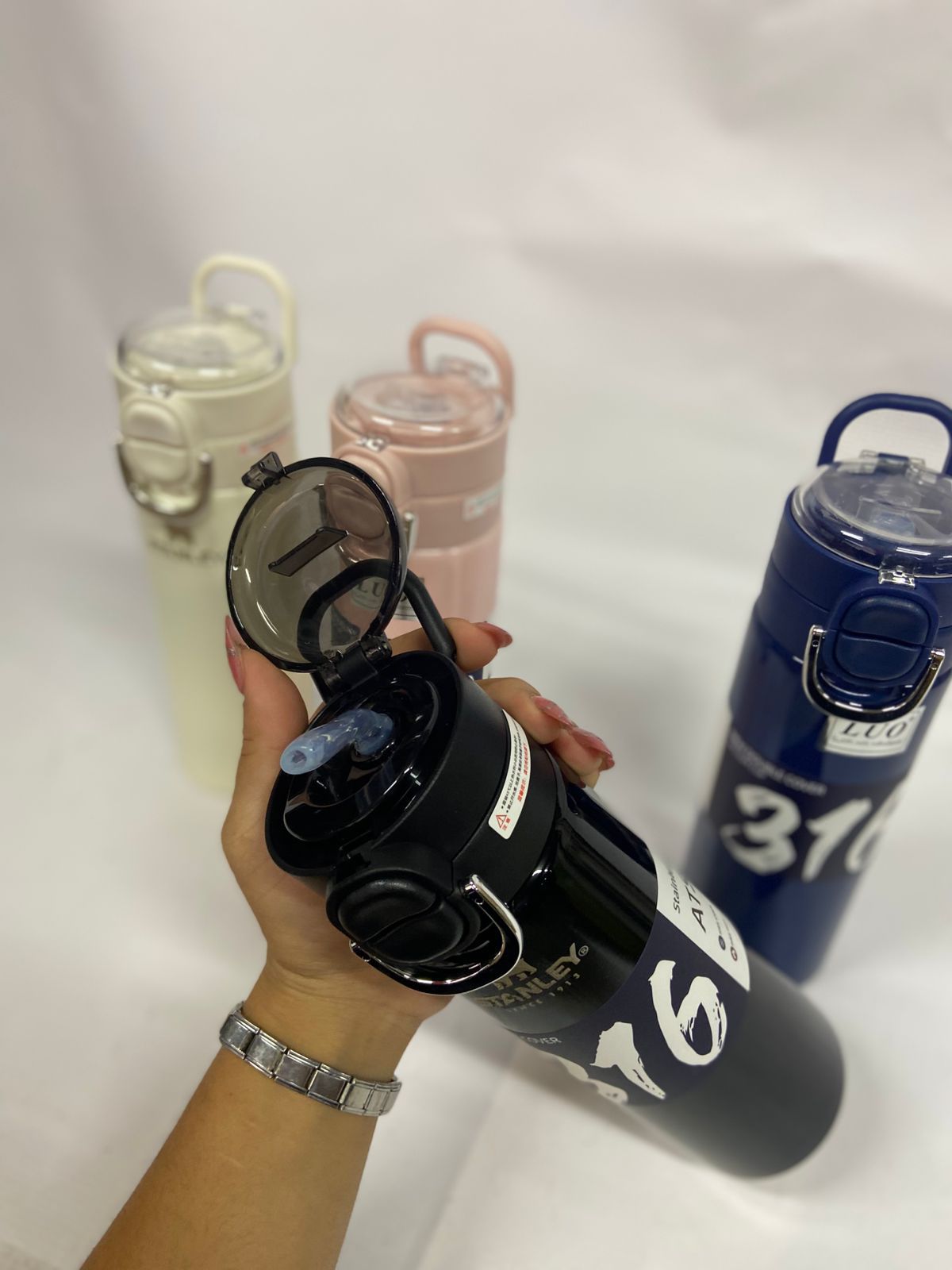 Botella térmica de acero inoxidable 316 con doble pico para fácil uso. Mantiene la temperatura de tus bebidas por horas. Ideal para el día a día, el trabajo o el gimnasio.