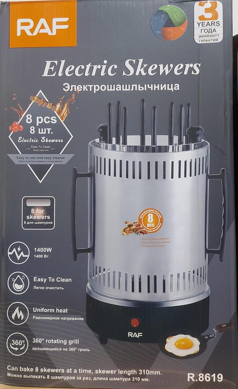 Brochera eléctrica profesional con accesorios para cocinar carnes, hamburguesas y sándwiches. Perfecta para asados rápidos y uniformes. Fácil de usar y limpiar.