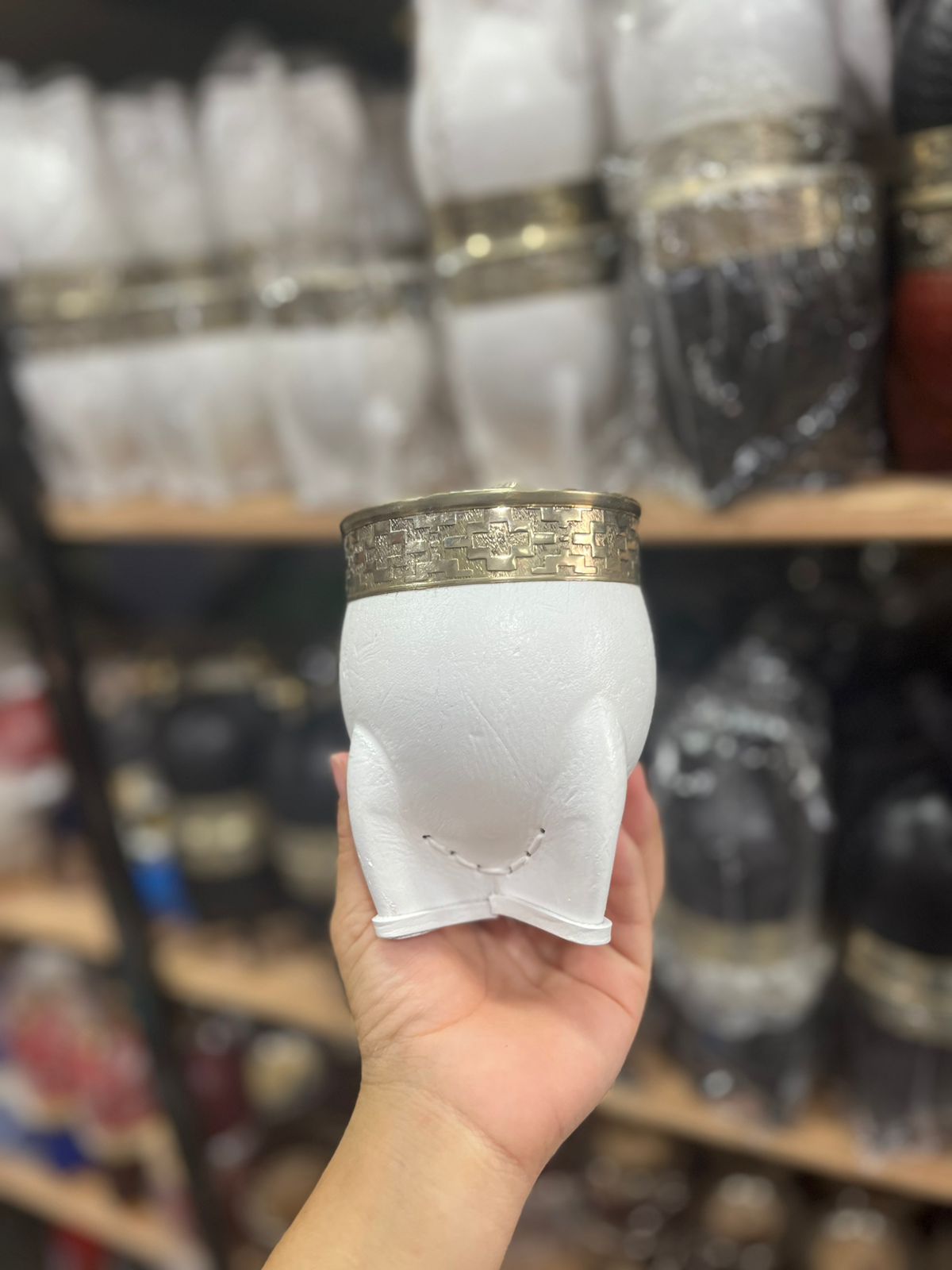 Calabaza Imperial forrada en cuero blanco con virola de alpaca 100%. Accesorio elegante y artesanal, perfecto para coleccionistas y amantes de la joyería fina.