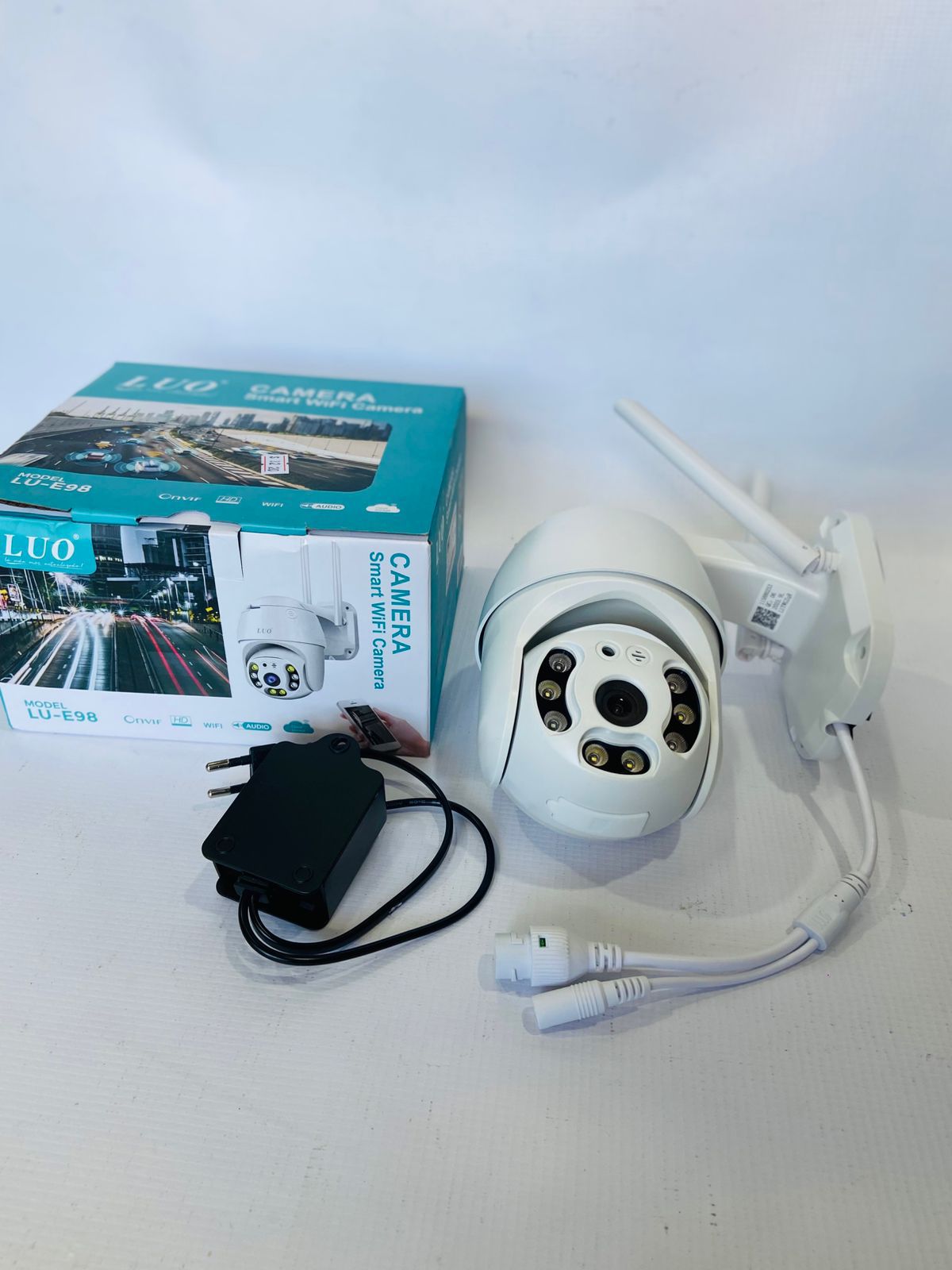 Cámara de seguridad LUO Lu-e98 con WiFi, visión nocturna a color, audio bidireccional, detección de movimiento y rotación 360°. Notificaciones en tiempo real para vigilancia completa del hogar o negocio.
