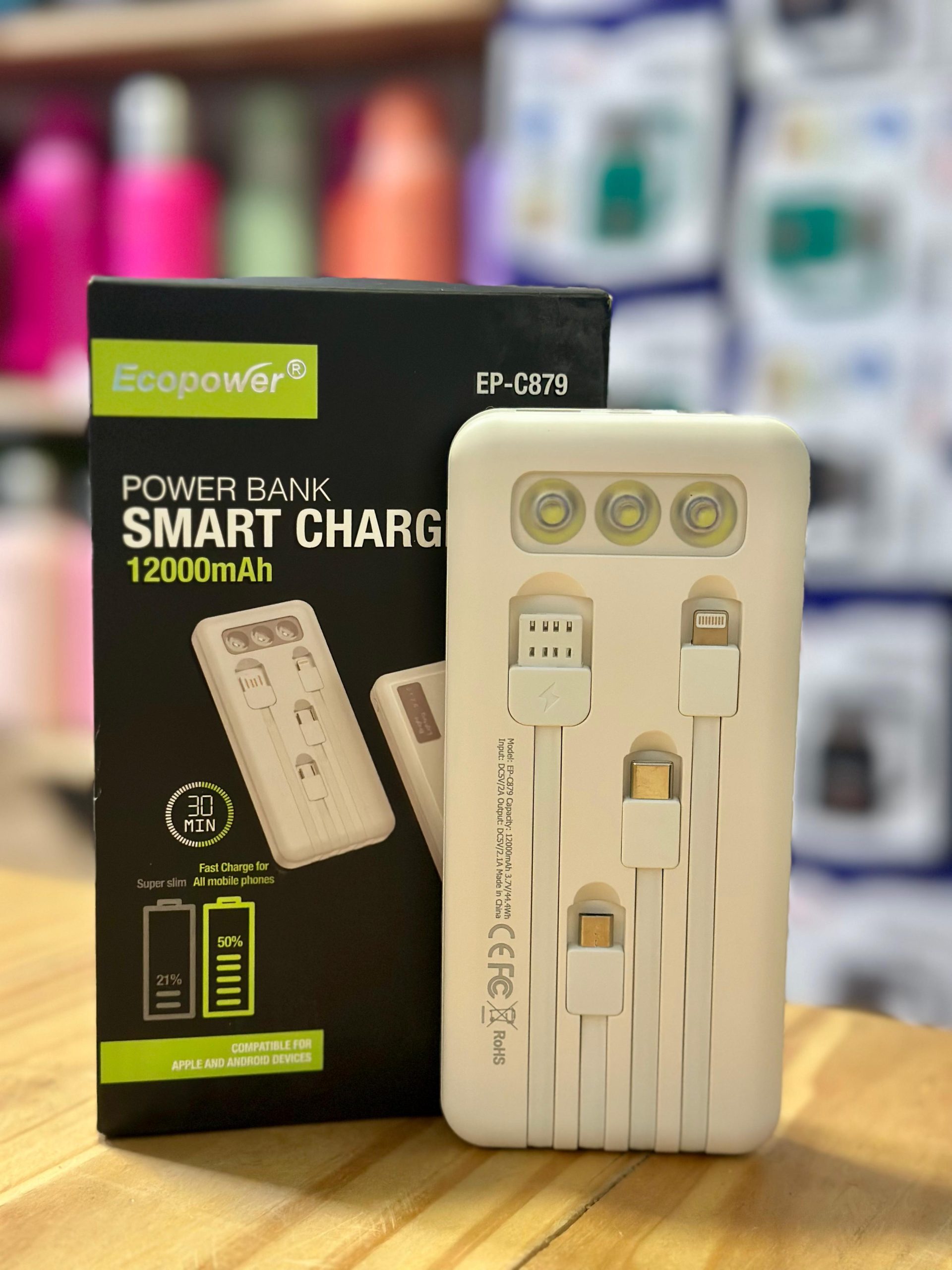 Cargador portátil de 12000 mAh, compacto y de alta capacidad. Ideal para viajes y uso diario. Carga rápida y segura para smartphones y tablets.