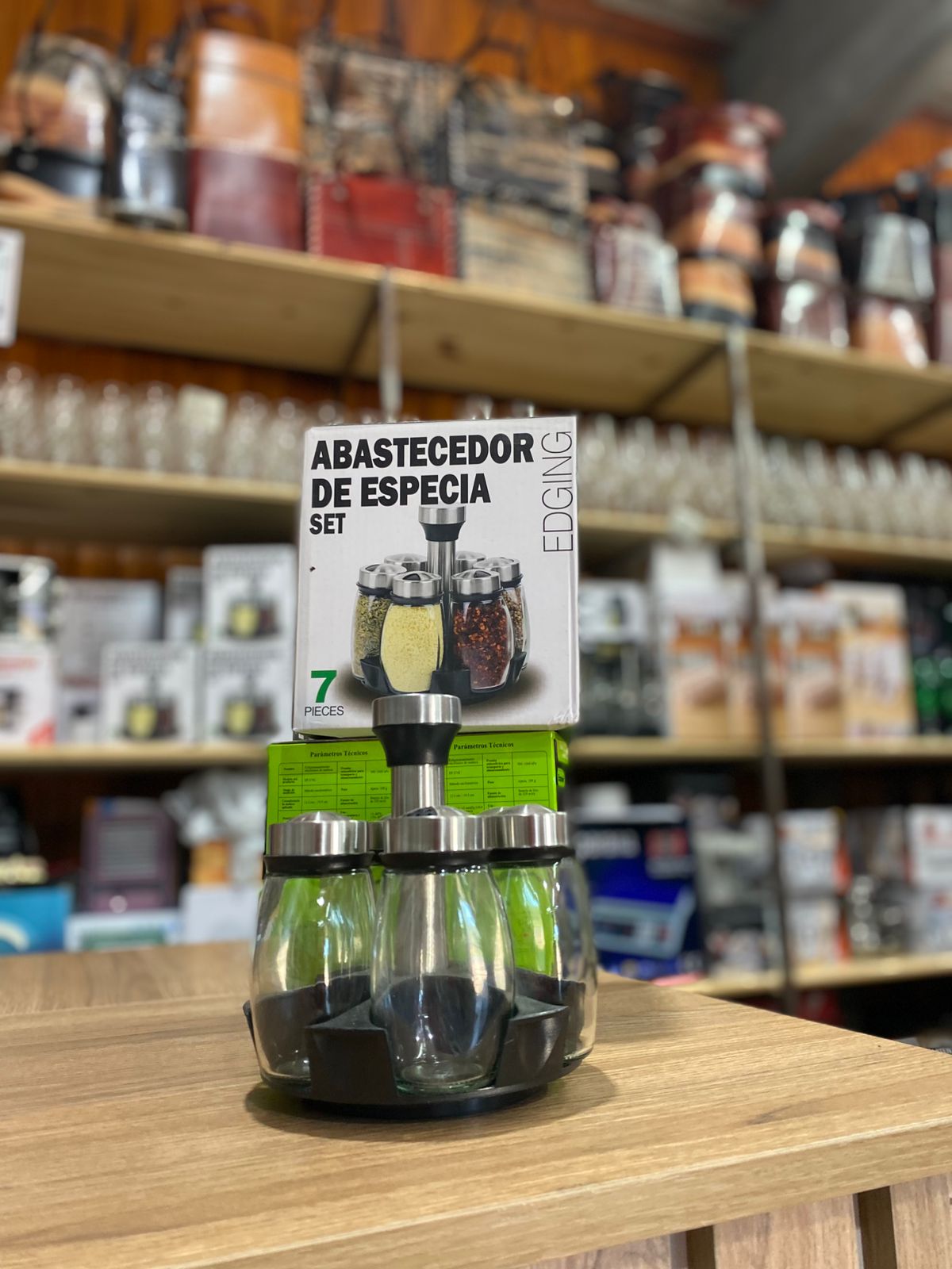 Set de 7 especieros de vidrio con base giratoria. Organiza tus especias de forma práctica y elegante en tu cocina. Ideal para mantener tus condimentos ordenados y accesibles.