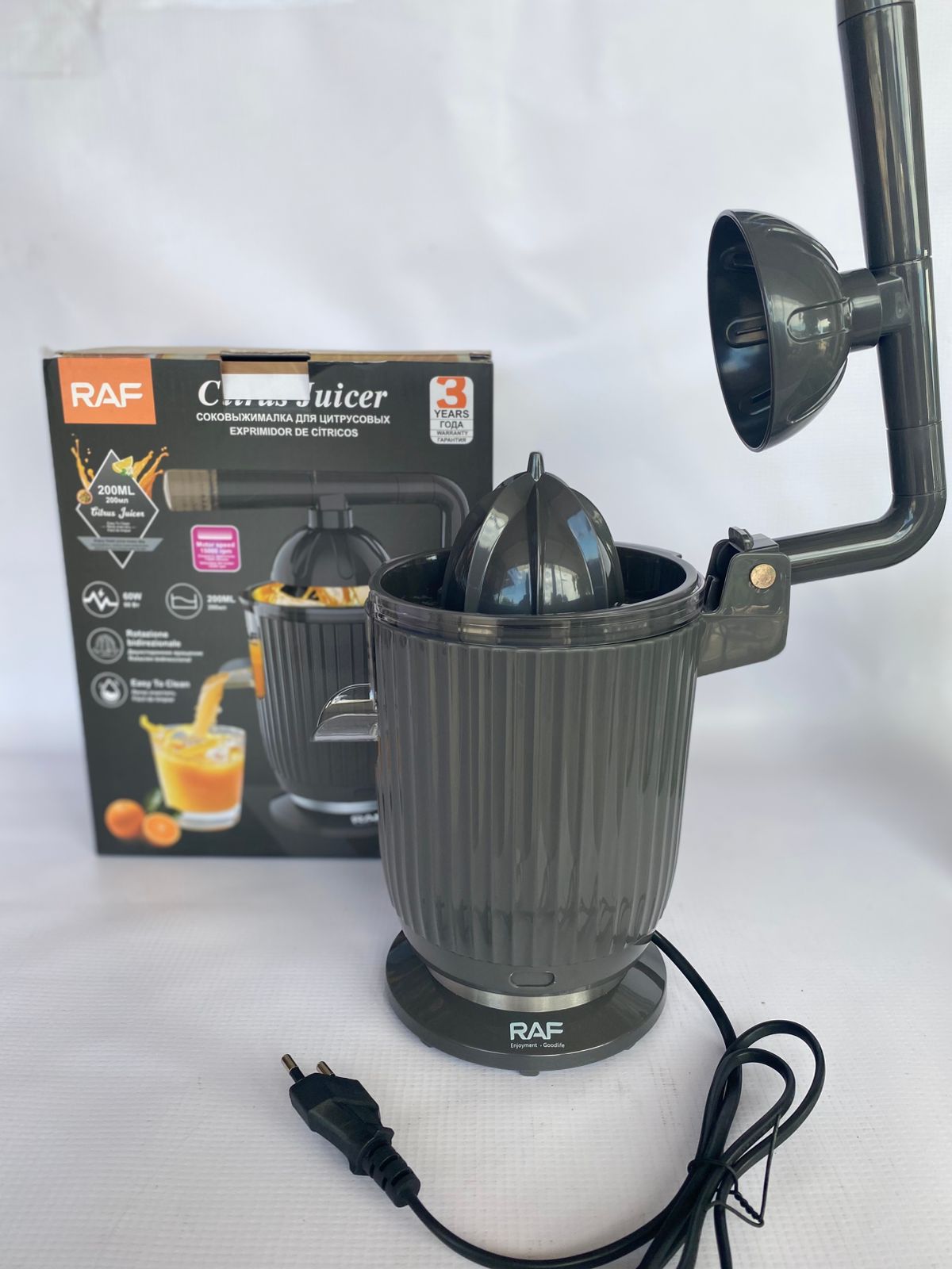 Exprimidor RAF premium, extrae 200ml de jugo natural en solo 60 segundos. Diseño eficiente y duradero para un zumo fresco al instante.