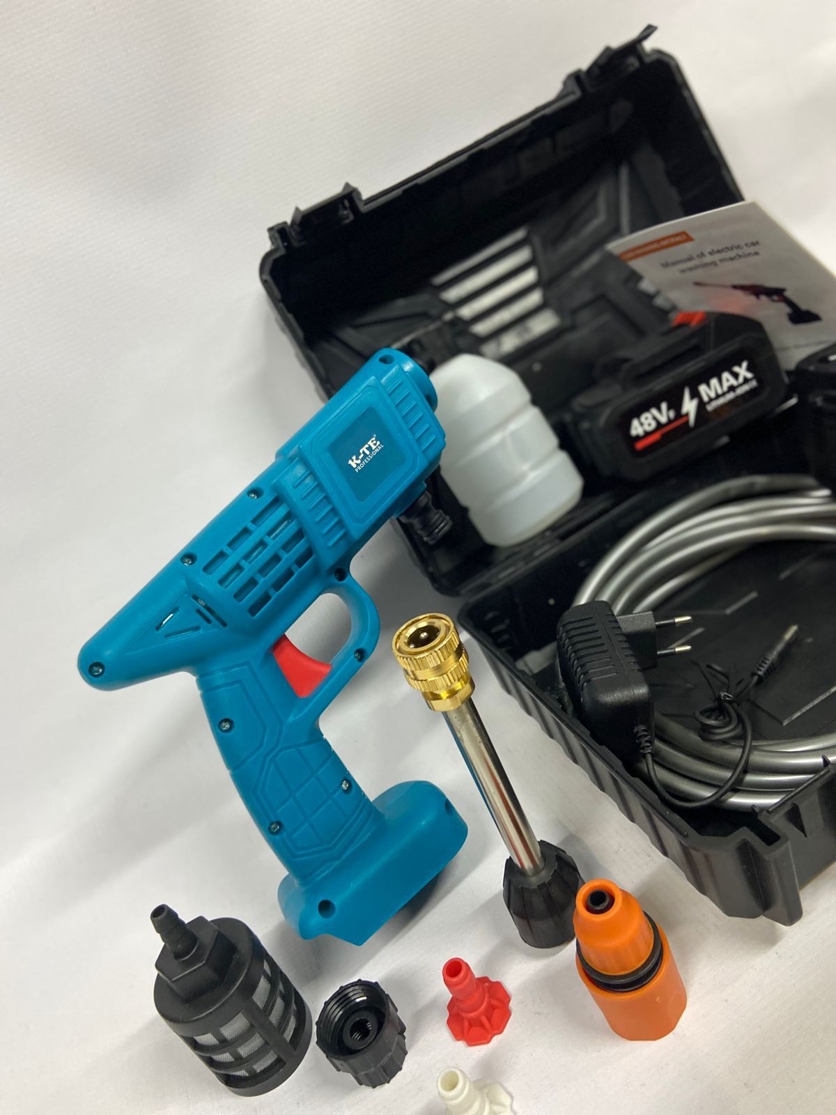 Hidrolavadora portátil compacta con accesorios incluidos. Ideal para limpieza profunda de coches, bicicletas y áreas exteriores. Fácil de transportar y almacenar.