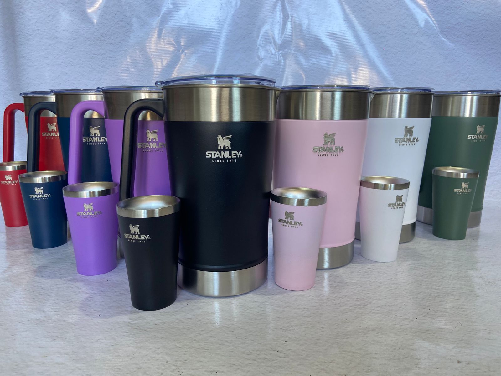 Jarras Stanley de acero inoxidable, colores lisos vibrantes. Perfectas para aventuras, mantienen bebidas frías o calientes por horas. Ideal para camping, trabajo o uso diario.
