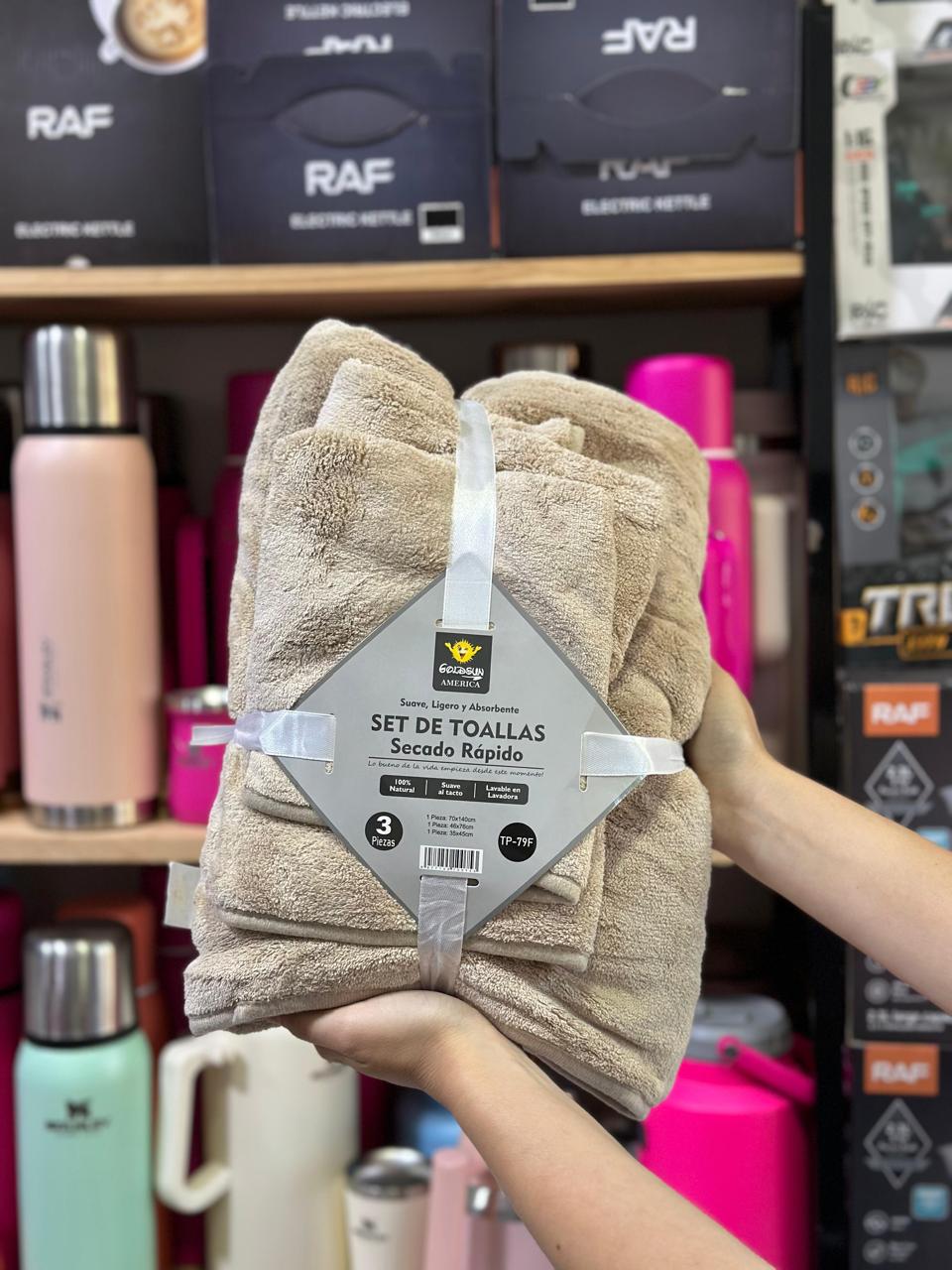 Juego de 3 toallas de secado rápido Goldsun. Incluye toalla de baño (70x140cm), toalla de mano (46x76cm) y toalla de rostro (35x45cm). Suave, absorbente y perfecto para tu baño.