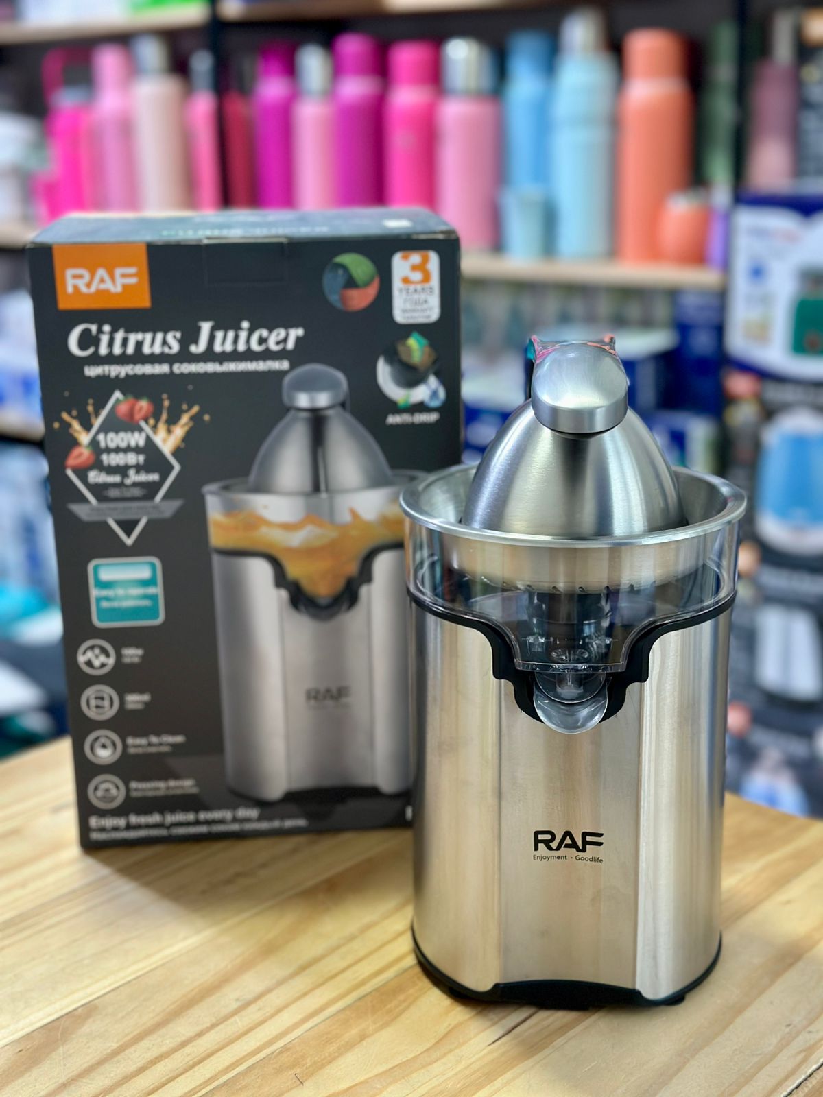 Juguera profesional de acero inoxidable marca Raf. Extrae zumo natural de cítricos de forma rápida y eficiente, fácil de limpiar y duradera. Ideal para bares y hogares.
