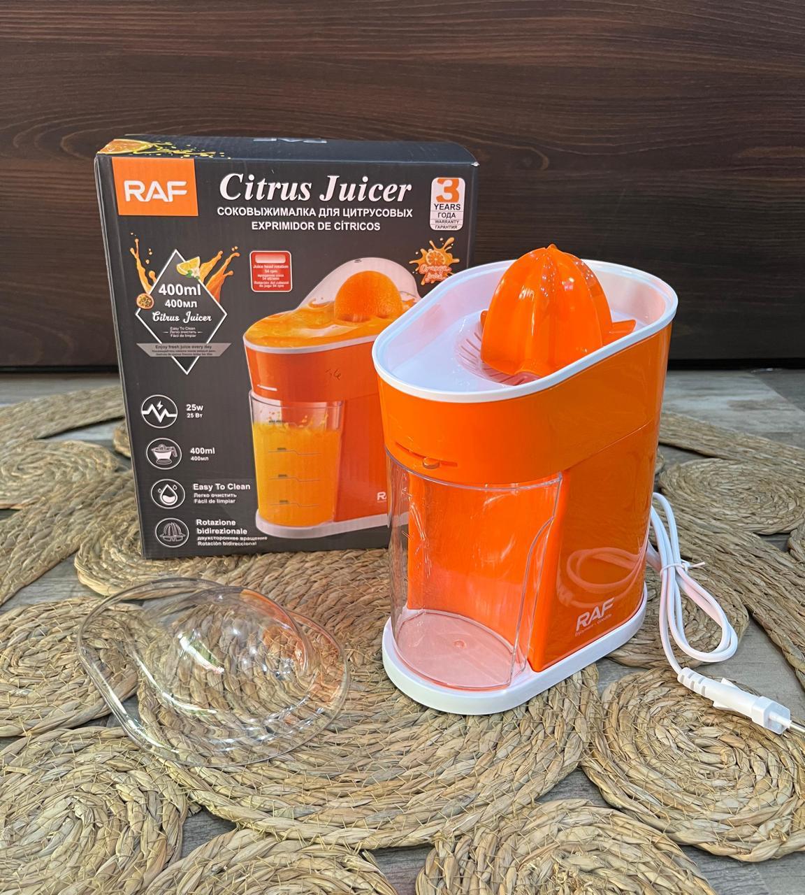 Juguera eléctrica marca Raf para extraer jugo fresco de naranjas y cítricos. Fácil de usar, eficiente y con diseño compacto para tu cocina.