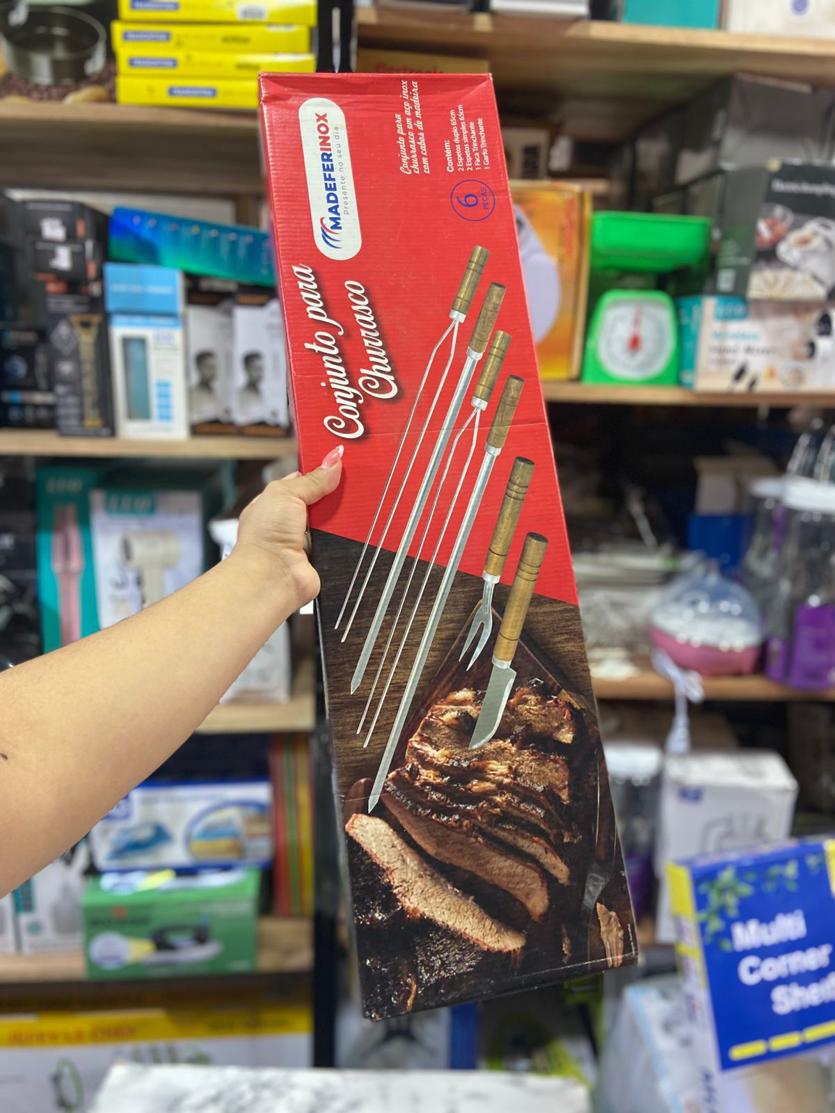 Kit asador grande de acero inoxidable premium con mango de madera gruesa. Ideal para parrillas, barbacoas y asados profesionales. Duradero y fácil de limpiar.