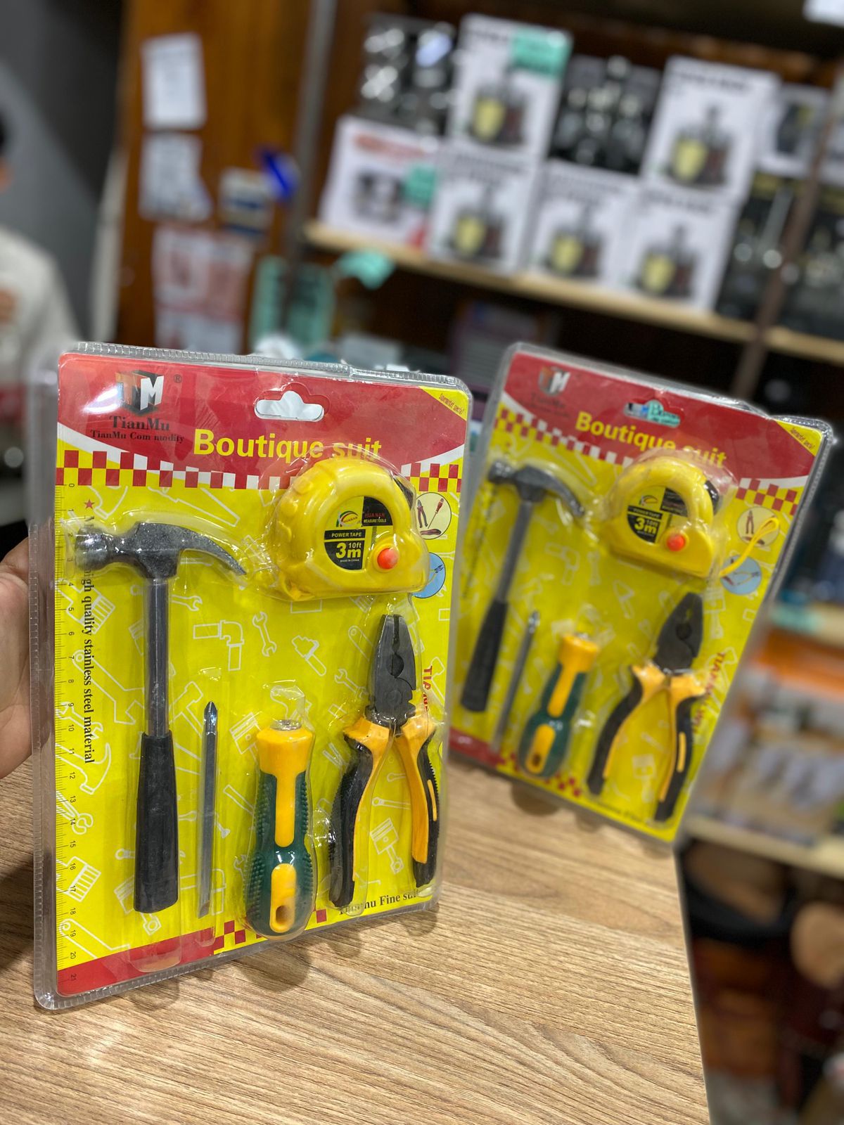 Kit de herramientas esencial para el hogar. Incluye metro, martillo, destornillador y pinza. Ideal para reparaciones básicas, montaje de muebles y bricolaje. Calidad profesional y ergonómica.