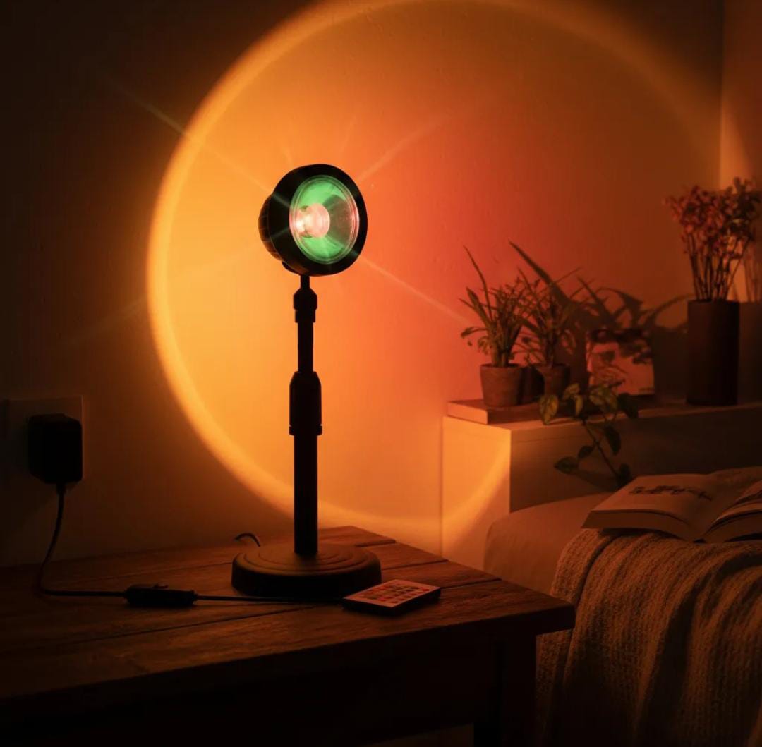 Lámpara decorativa que proyecta un relajante atardecer. Control remoto para cambiar colores y modos. Conexión USB para fácil alimentación. Ideal para crear ambiente.