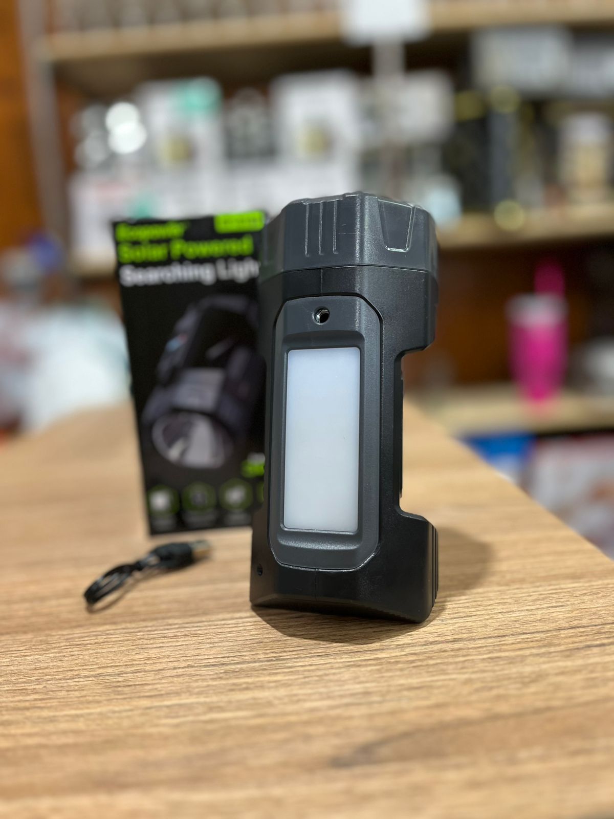 Linterna recargable con panel solar integrado, ideal para camping y emergencias. Ofrece 300 lúmenes de potencia, autonomía duradera y es resistente al agua.