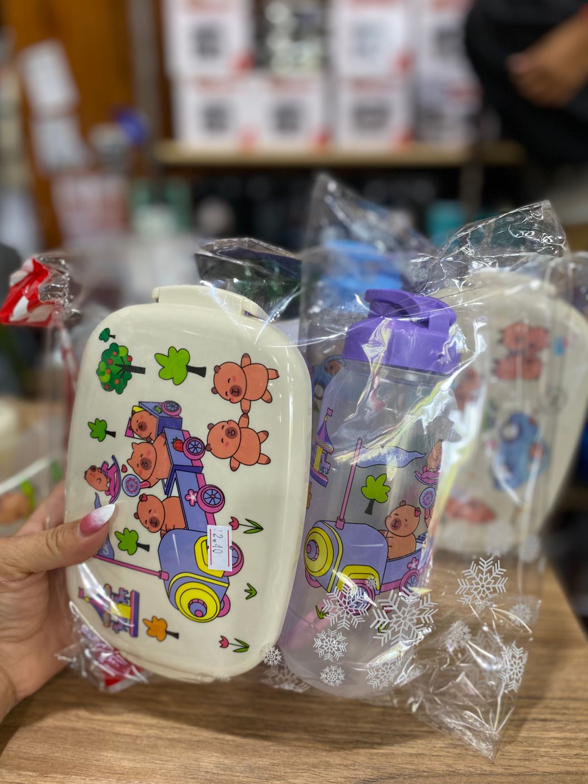 Lonchera escolar con botella plástica incluida. Ideal para niños y niñas. Material resistente y fácil de limpiar. Diseño atractivo para el colegio o paseos.