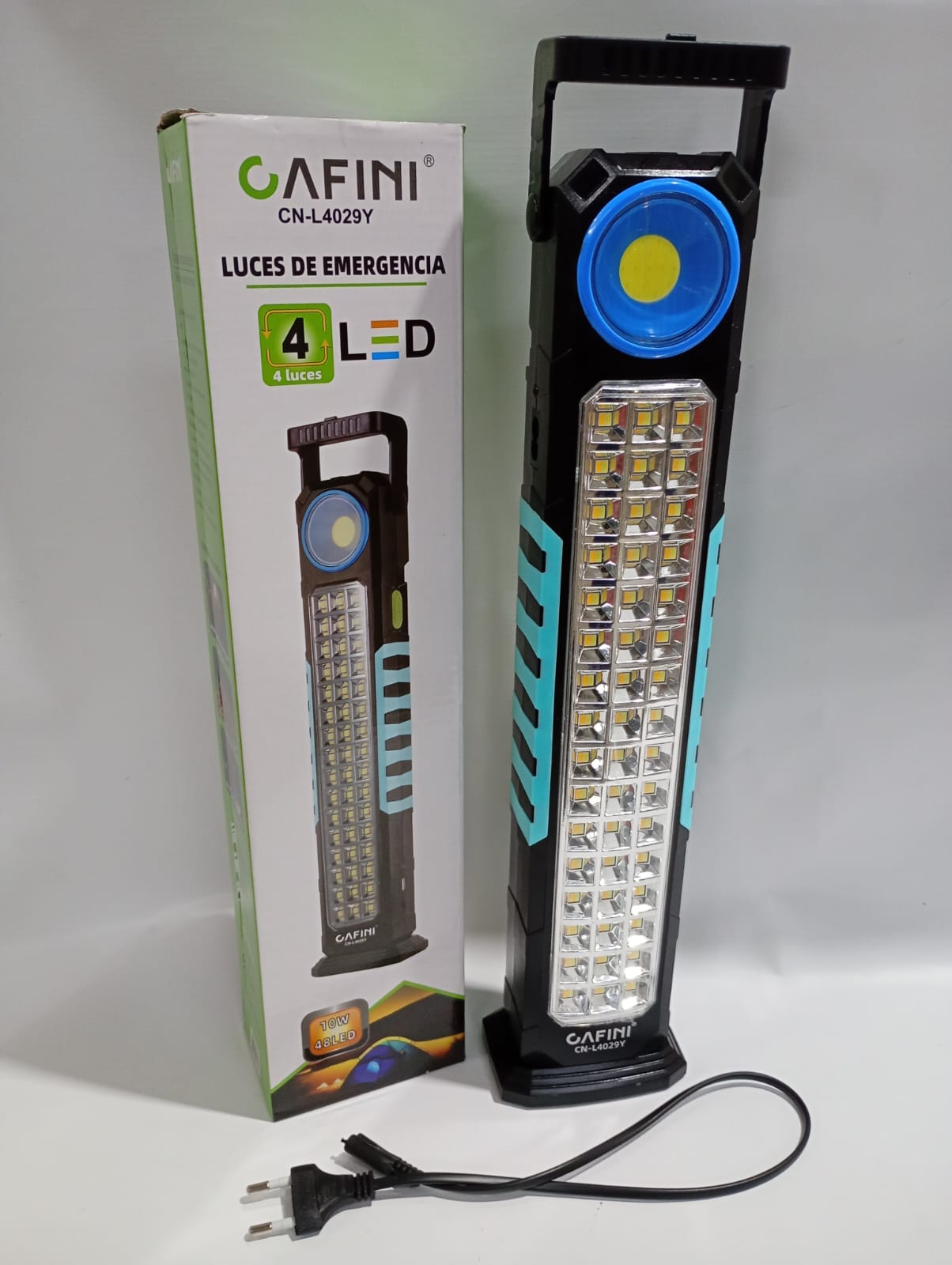 Luz de emergencia CAFINI con 4 niveles de luminosidad. Diseño portátil con manija para colgar y carga USB, ideal para el hogar, camping o cualquier emergencia. Fiable y práctica.