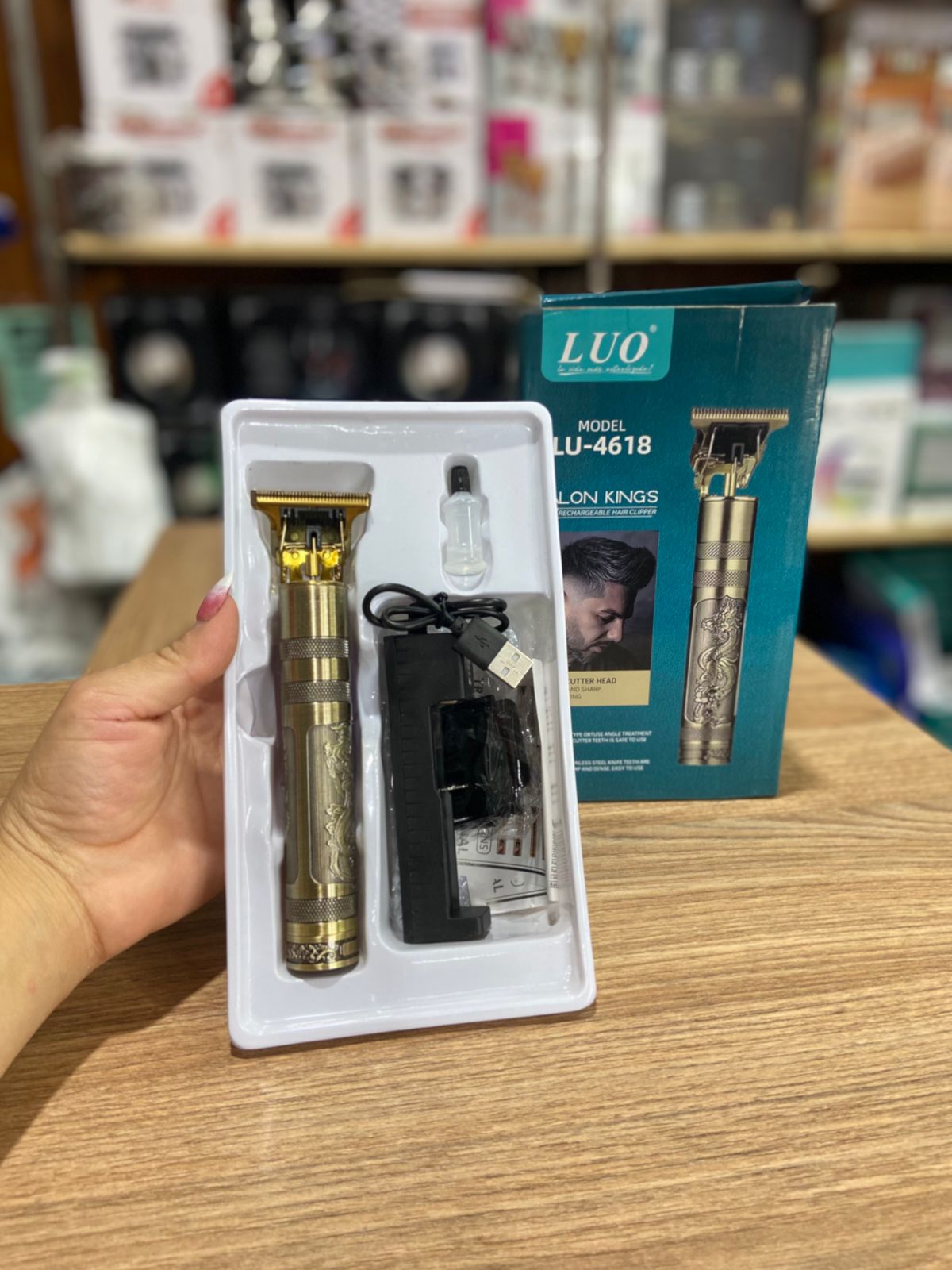 Máquina patillera inalámbrica LUO Lu-4617, recargable USB. Incluye peines guías, aceite lubricante y cepillo. Perfecta para contornos precisos de barba, nuca y patillas.
