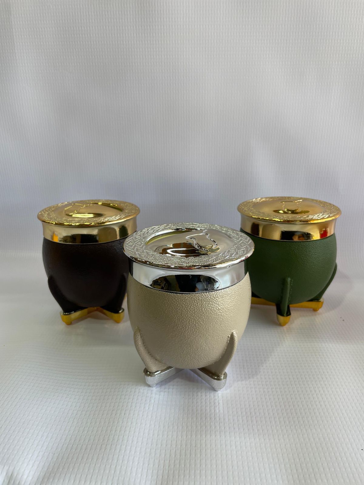 Mates de PVC con diseño de media tapa y forro interior, ideales para evitar derrames. Estilo decorativo y funcional para disfrutar tu bebida favorita con seguridad y buen gusto.