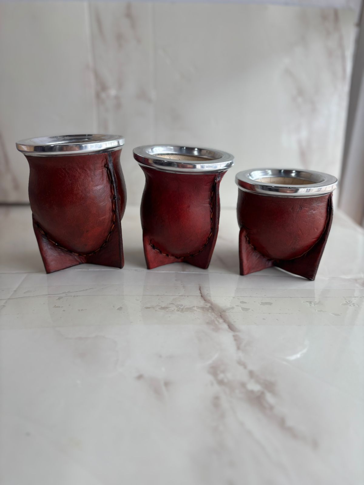 Mate clásico forrado en cuero vaqueta con virola de aluminio plateado. Calabaza tradicional, diseño duradero y elegante para disfrutar de la mejor yerba mate.