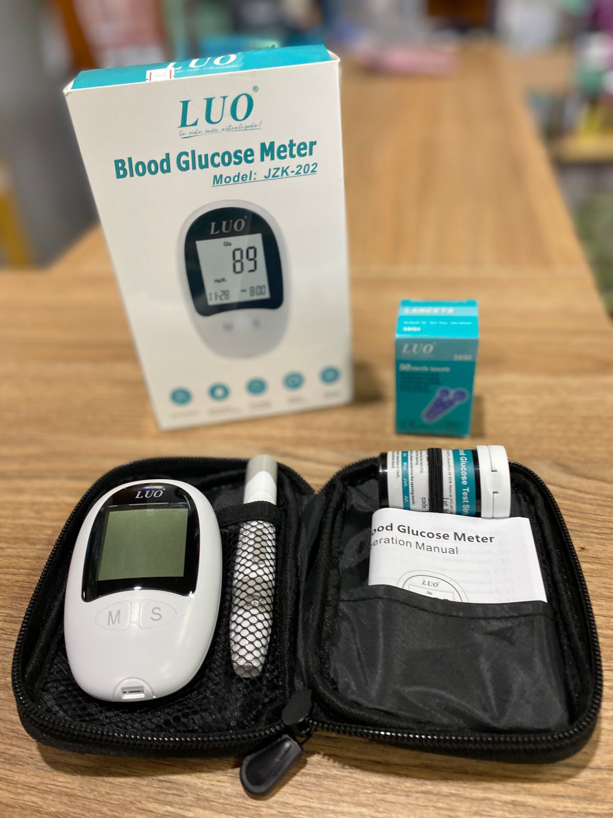 Medidor de glucosa LUO para control diabético preciso. Incluye cartuchera y todos los accesorios esenciales para un monitoreo fácil y confiable en casa.