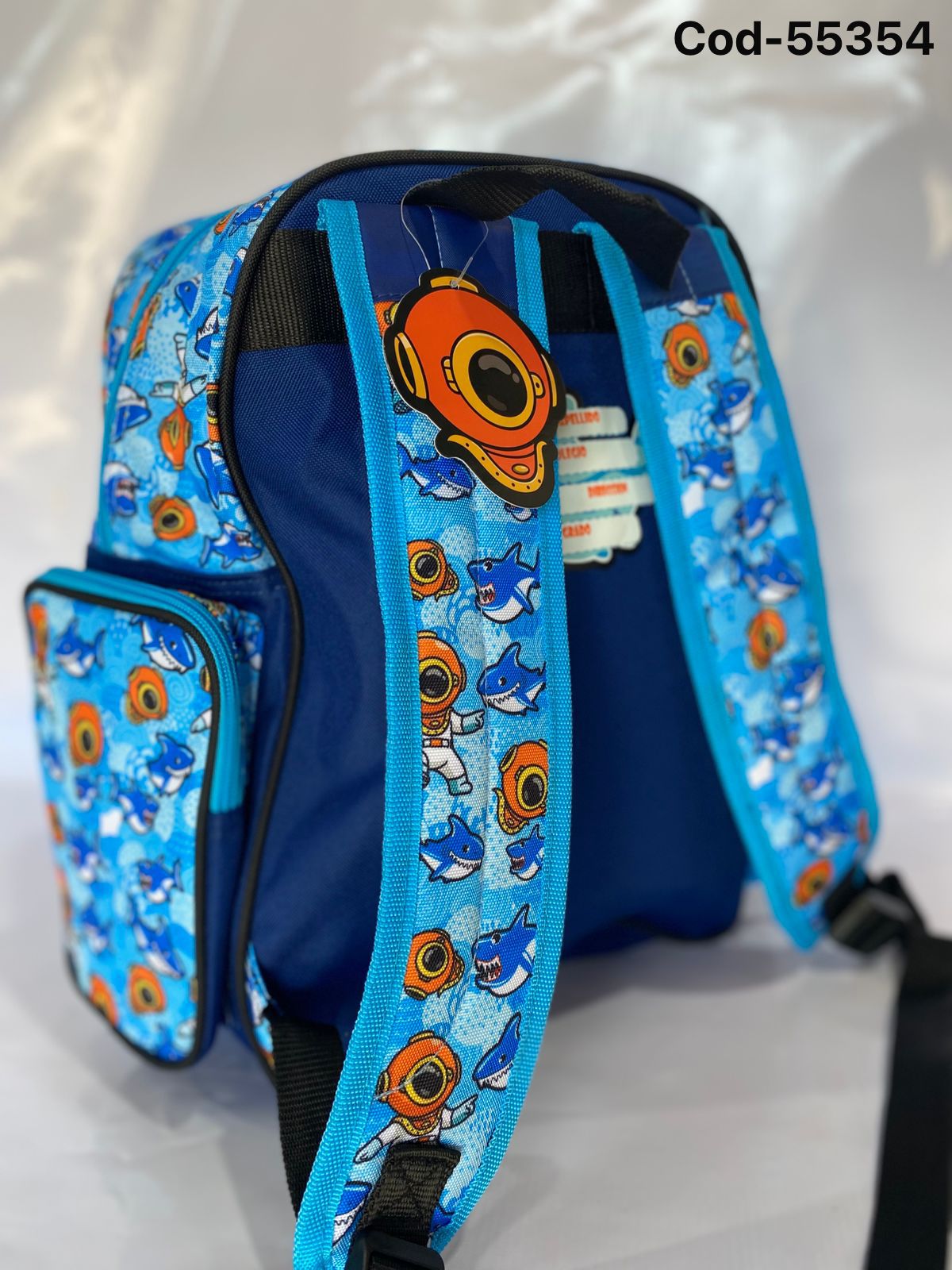 Mochila infantil con diseño de tiburón, ideal para el colegio. Cuenta con 4 compartimentos espaciosos, correas ajustables y materiales resistentes para el día a día.