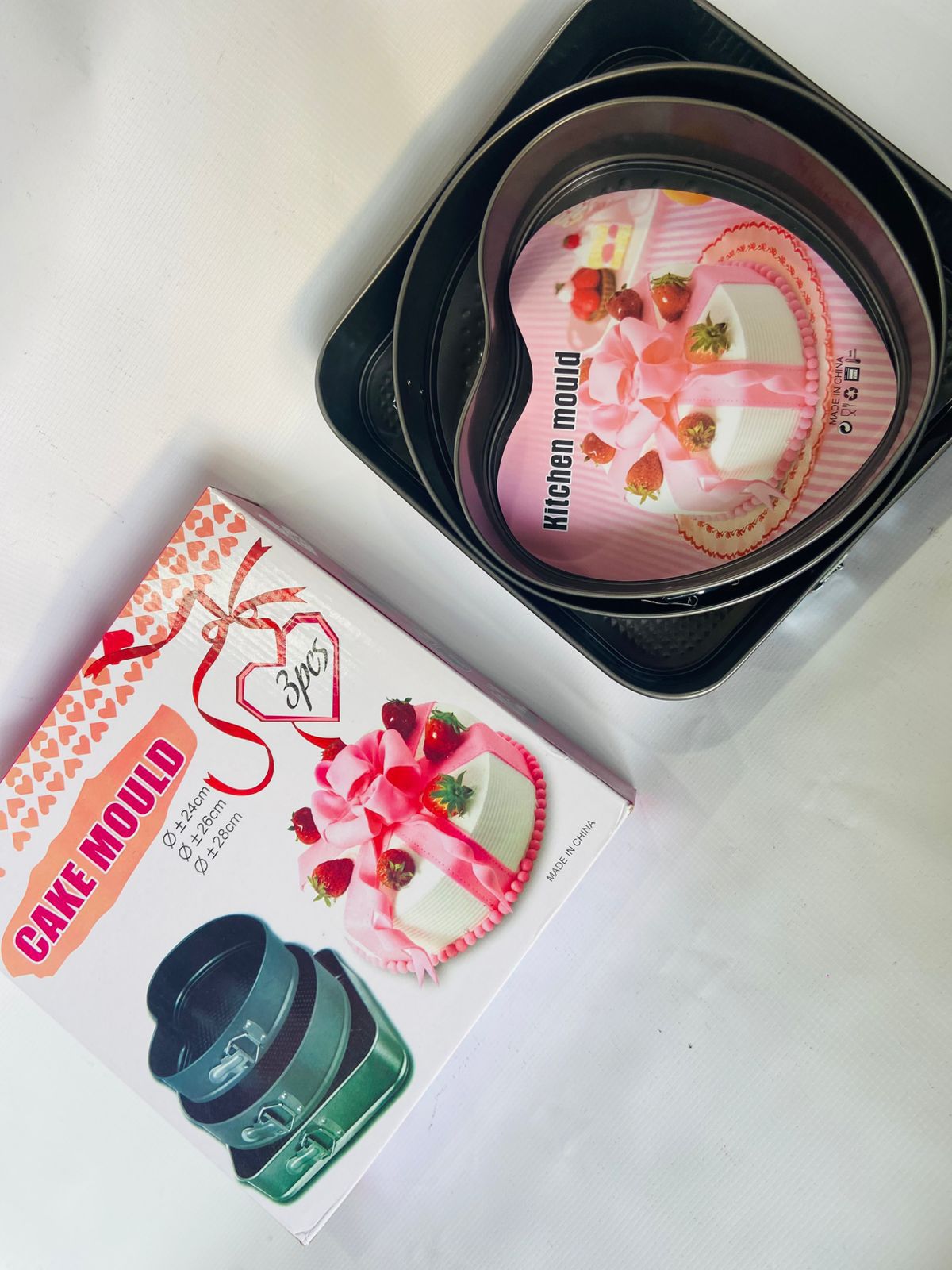 Set de 3 moldes desmontables antiadherentes en forma de corazón para hornear tortas perfectas. Fácil limpieza y desmolde. Ideal para repostería creativa.