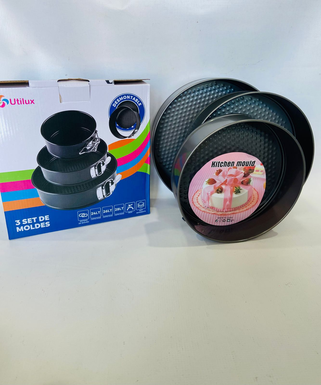 Set de 3 moldes para hornear Utilux. Perfectos para tartas y bizcochos. Material resistente y fácil de desmoldar. Ideal para repostería casera y profesional.