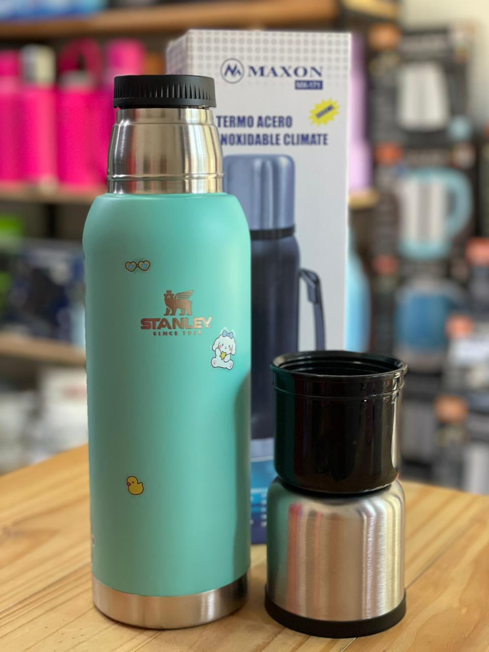 Termo de acero inoxidable de 1 litro sin manija. Ideal para mantener bebidas frías o calientes durante horas. Diseño compacto y funcional para uso diario.