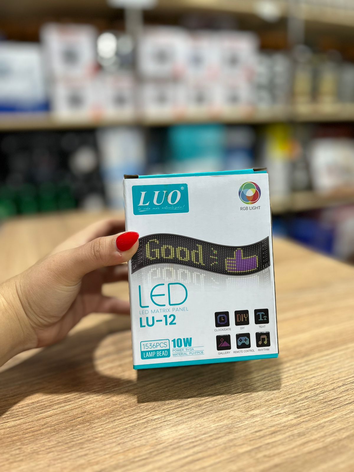 Panel LED LU-12 para auto o camión. Control por app móvil, muestra texto personalizable y contenido DIY. Ideal para mensajes personalizados y decoración vehicular.