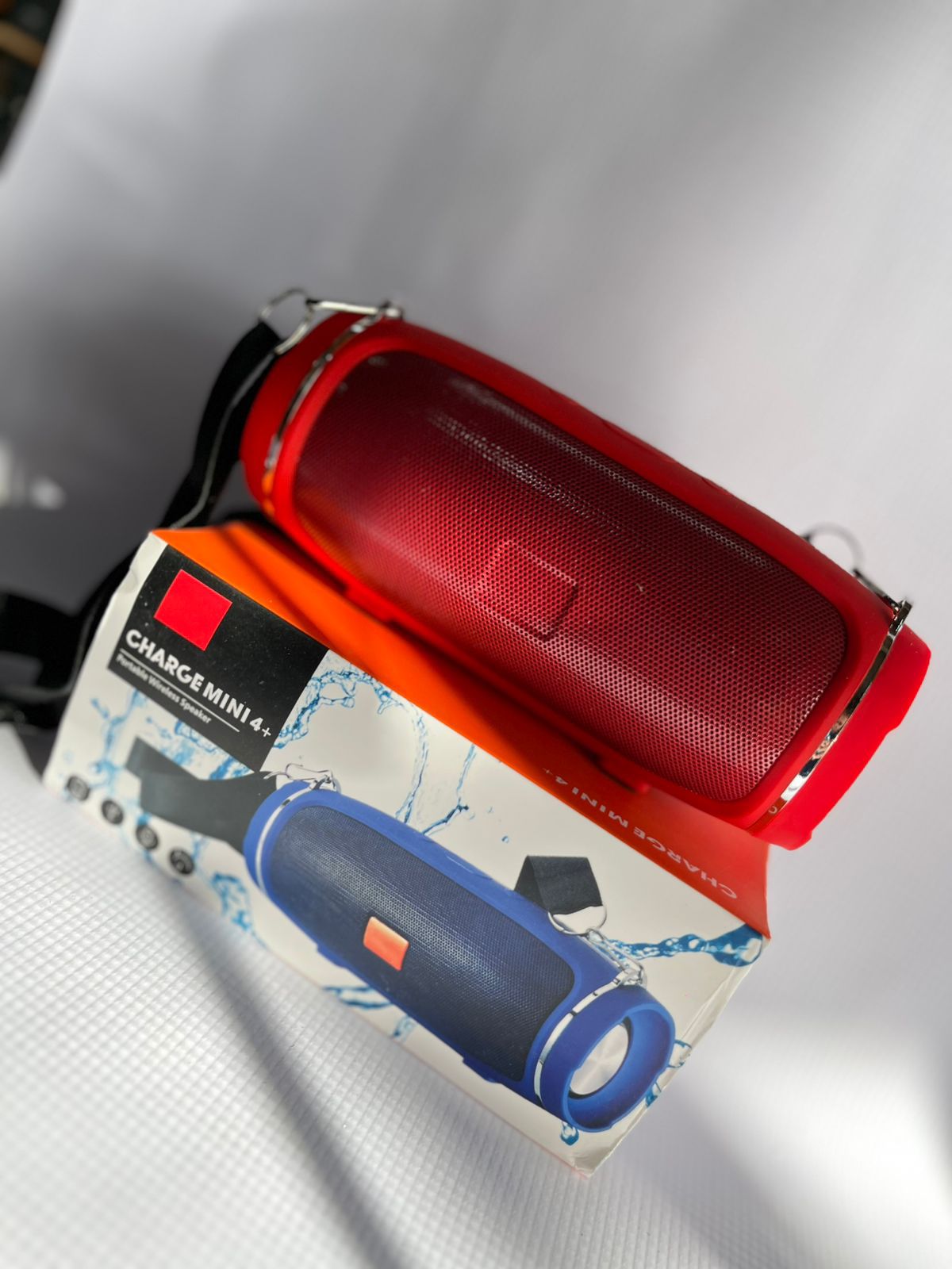 Altavoz Bluetooth portátil JBL Charge Mini con correa para transportar. Sonido potente y batería de larga duración. Ideal para música en movimiento.