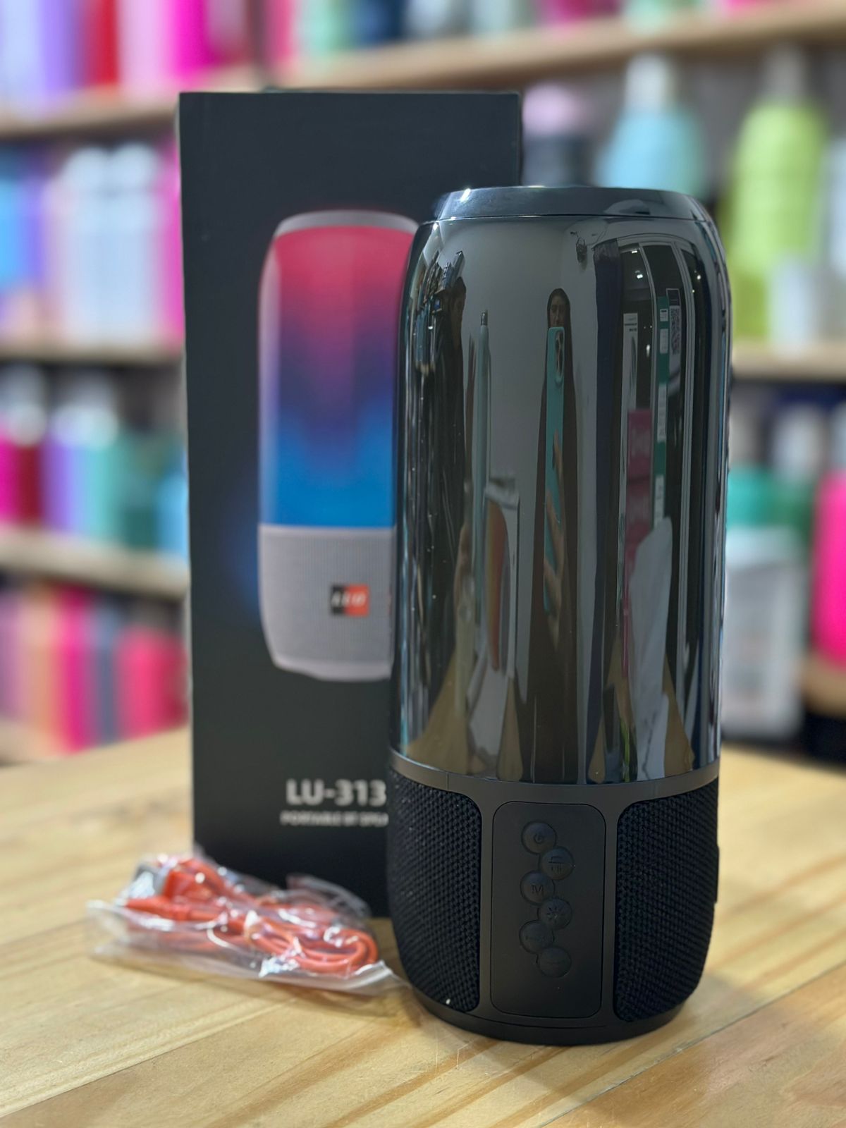 Parlante Bluetooth portátil con iluminación LED multicolor. Ideal para fiestas, ofrece sonido potente y efectos de luz vibrantes. Perfecto para uso interior y exterior.
