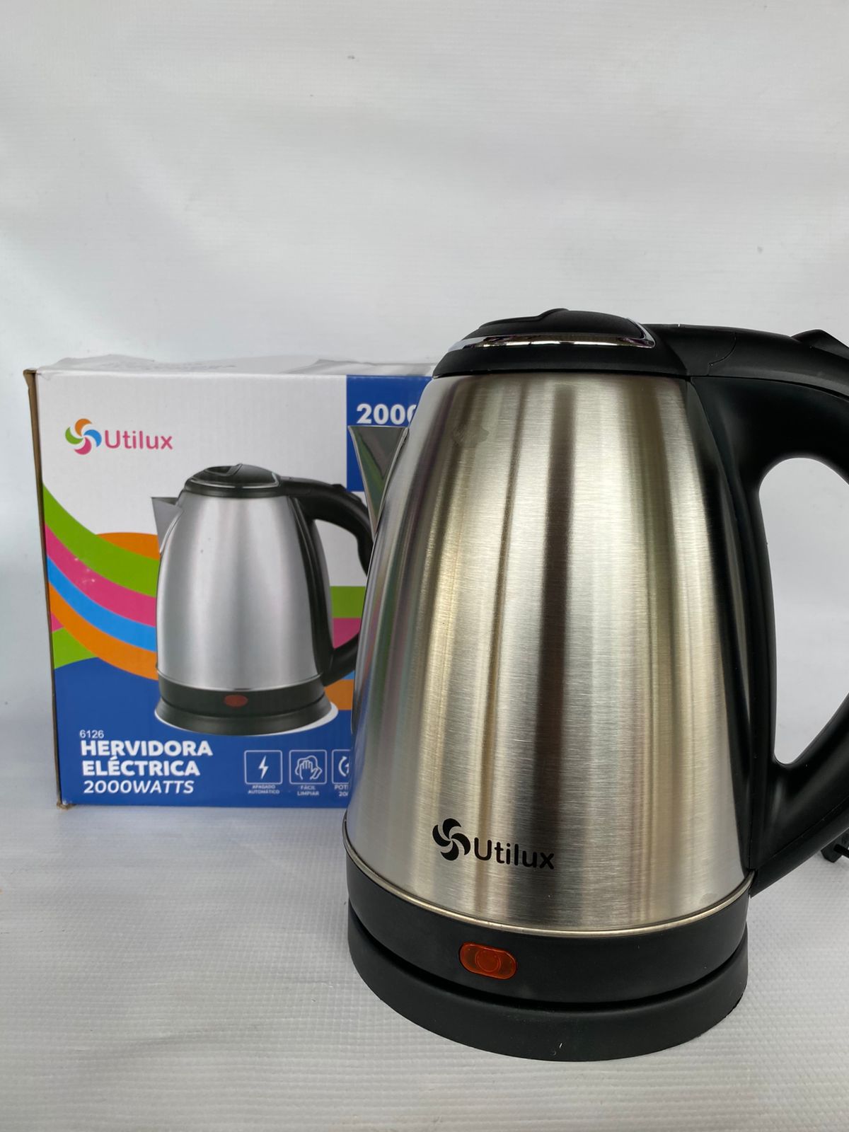 Pava eléctrica UTILUX de 2000W y 2 litros de capacidad. Calentamiento rápido y seguro, ideal para preparar infusiones, mate o agua caliente en casa u oficina.