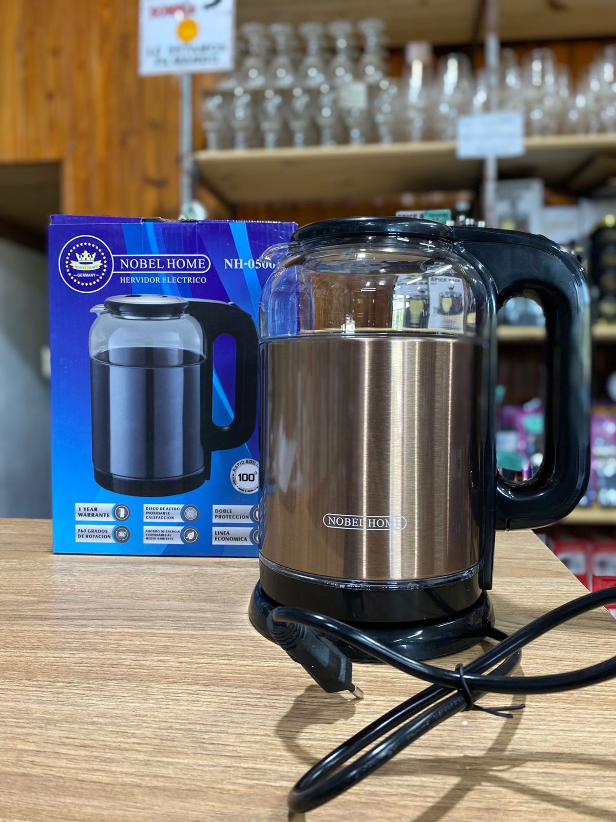 Pava eléctrica NOBEL HOME de 2 litros. Calienta agua de forma rápida y segura con su apagado automático. Ideal para mate, té o infusiones. Diseño moderno y funcional para tu cocina u oficina.