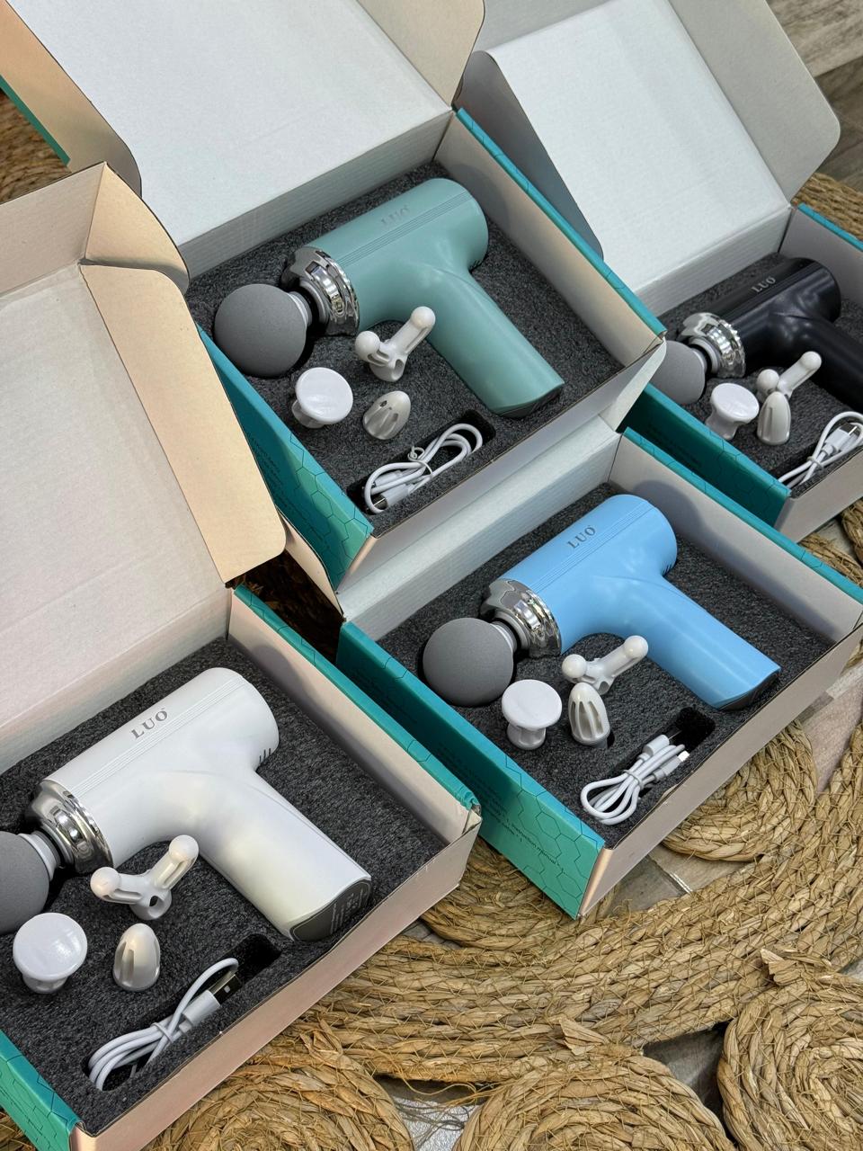 Pistola masajeadora Luo 4 en 1 con cabezales intercambiables para masaje profundo, alivio muscular y recuperación deportiva. Potente, portátil y recargable.