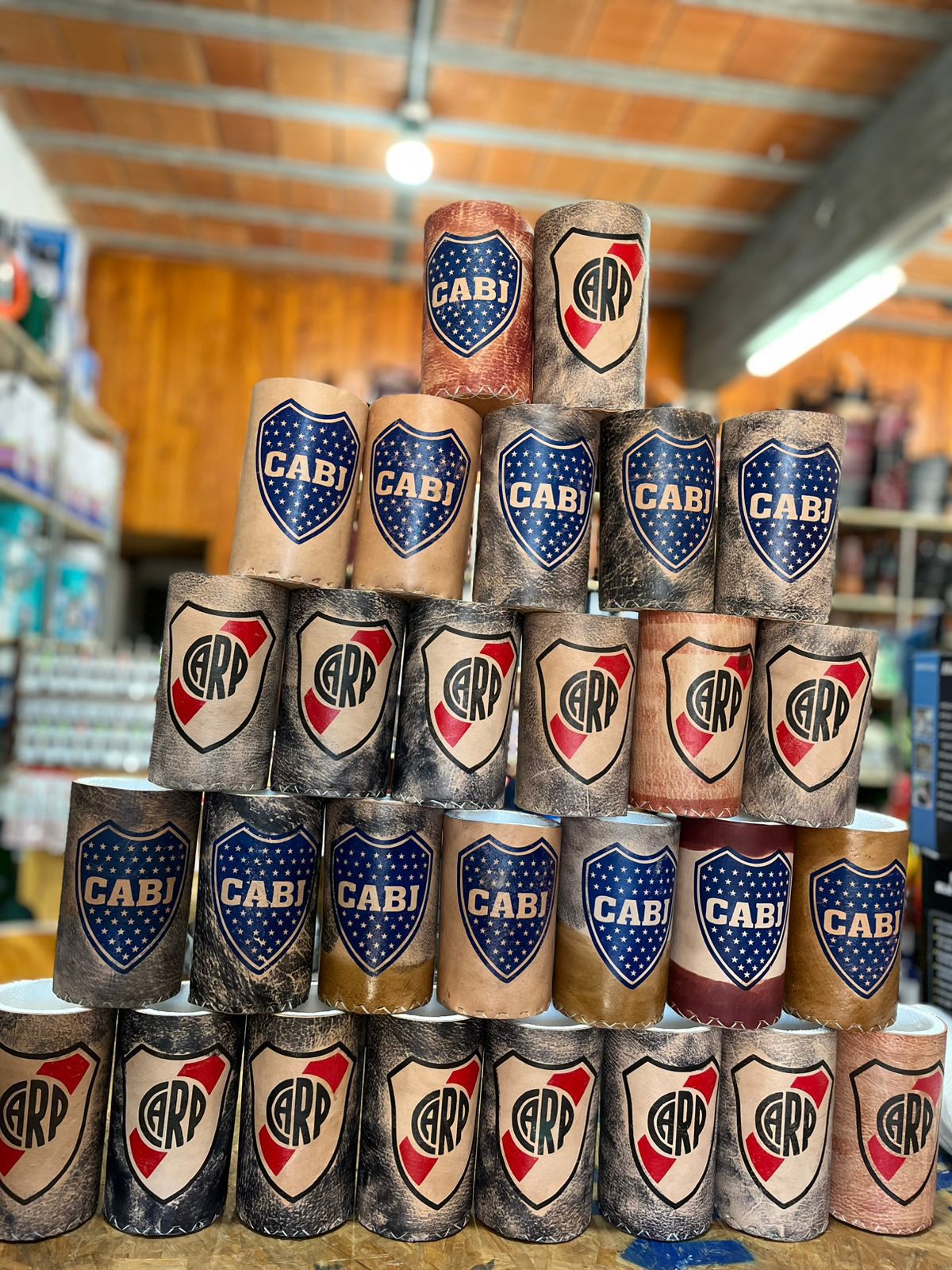 Porta lata de cerveza forrado en cuero Terbopol. Variedad de modelos. Ideal para mantener tu bebida fría y con estilo. Accesorio práctico y elegante.