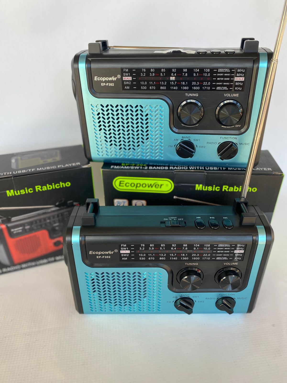 Radio portátil ECOPOWER EP-F302 con sintonía FM/AM/SW1, reproductor MP3, entrada para pendrive, alimentación por pilas, antena integrada y función de recarga de batería. Sonido de calidad y gran autonomía.