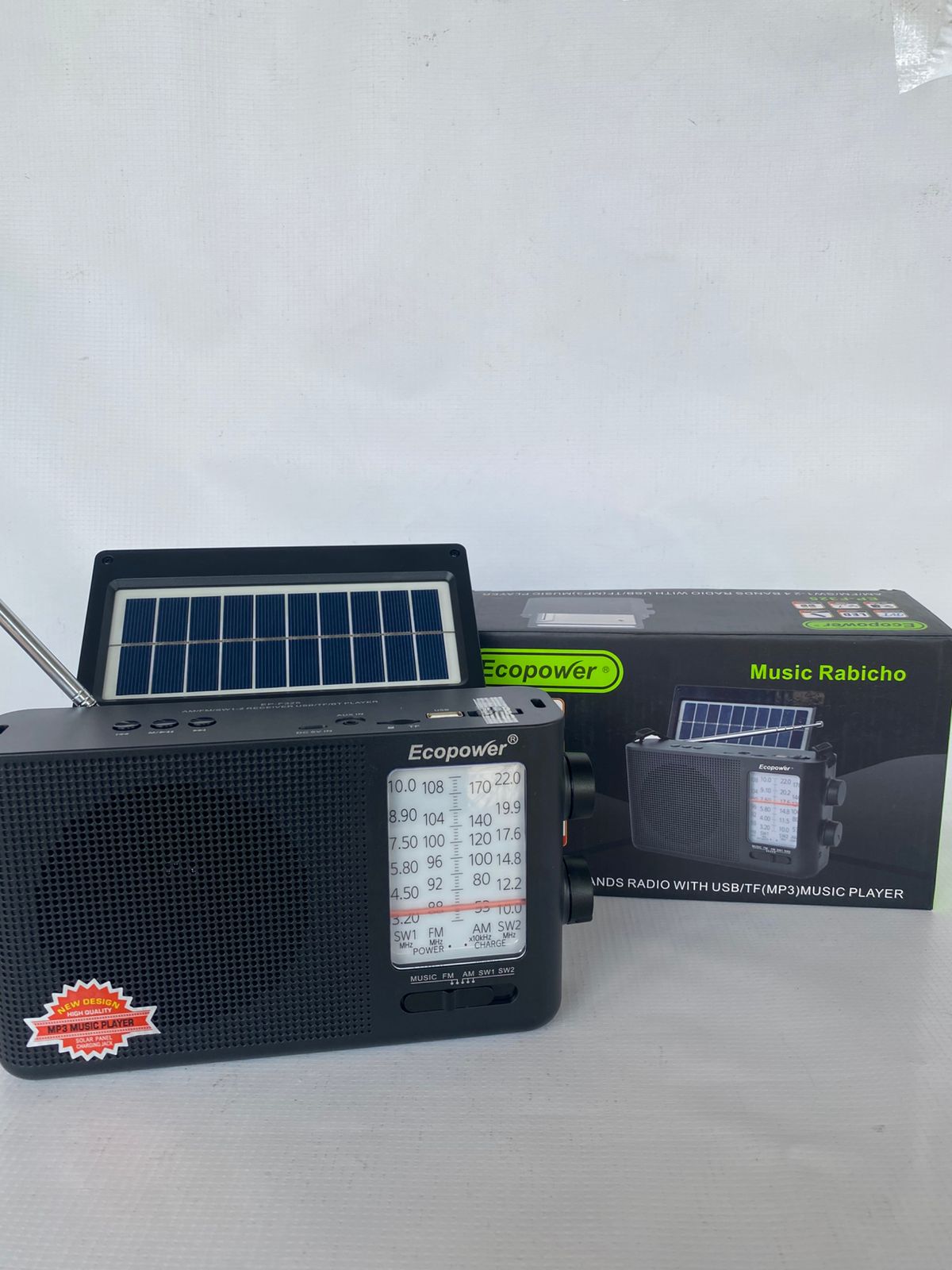 Radio portátil LUO 325 con control de volumen y sintonía. Incluye cargador solar para energía renovable. Ideal para exteriores, emergencias y aficionados a la radio.