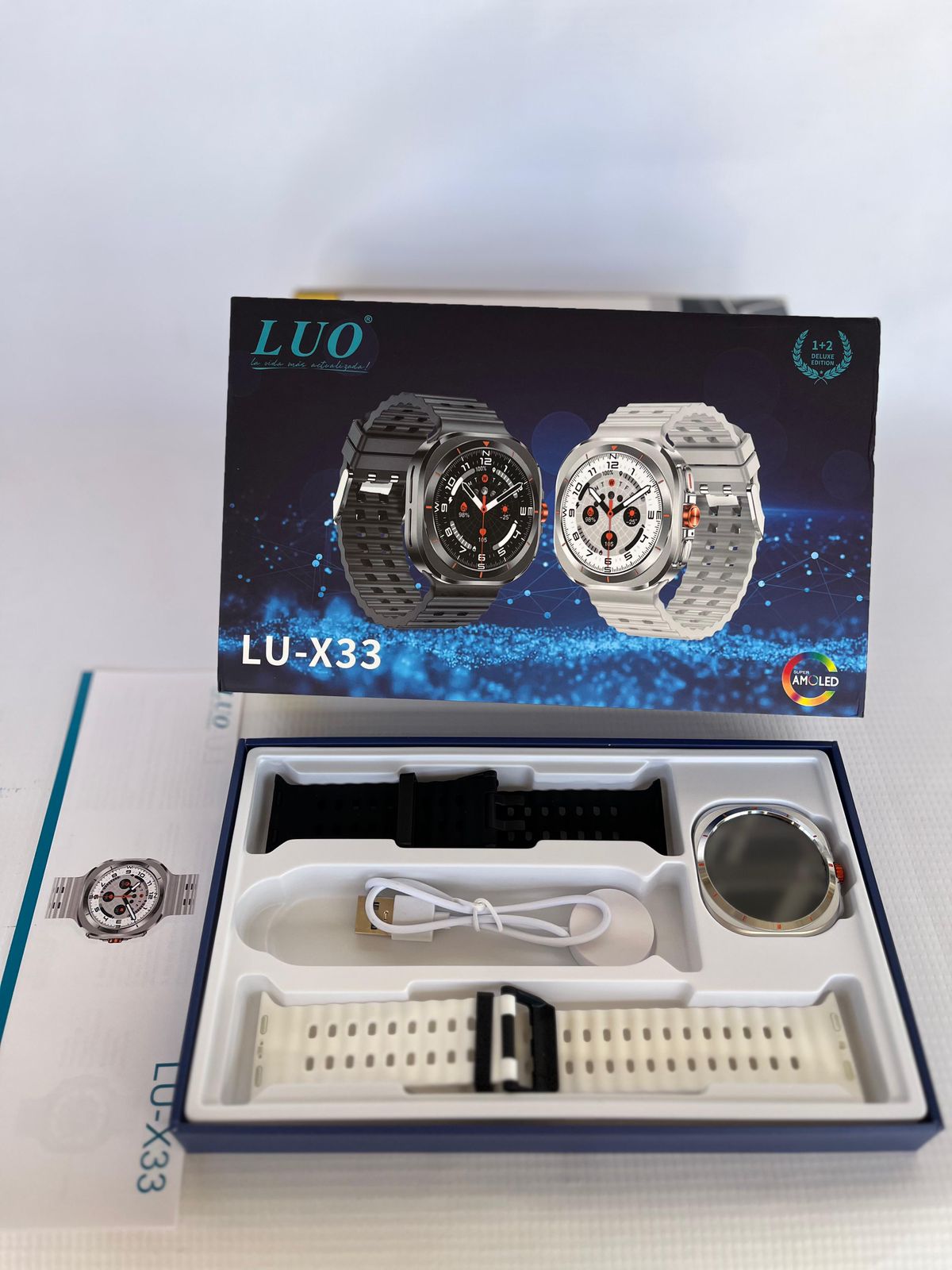 Reloj inteligente S-Mart LU-x33 con carga inalámbrica, 2 pulseras intercambiables y múltiples aplicaciones. Funciona como teléfono independiente. Ideal para deporte y vida diaria.