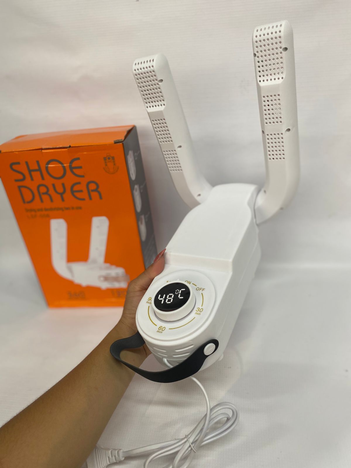 Secador de zapatillas eléctrico con temporizador ajustable (20, 30, 60, 90 min) y múltiples temperaturas. Elimina la humedad y el mal olor de forma rápida y eficaz.