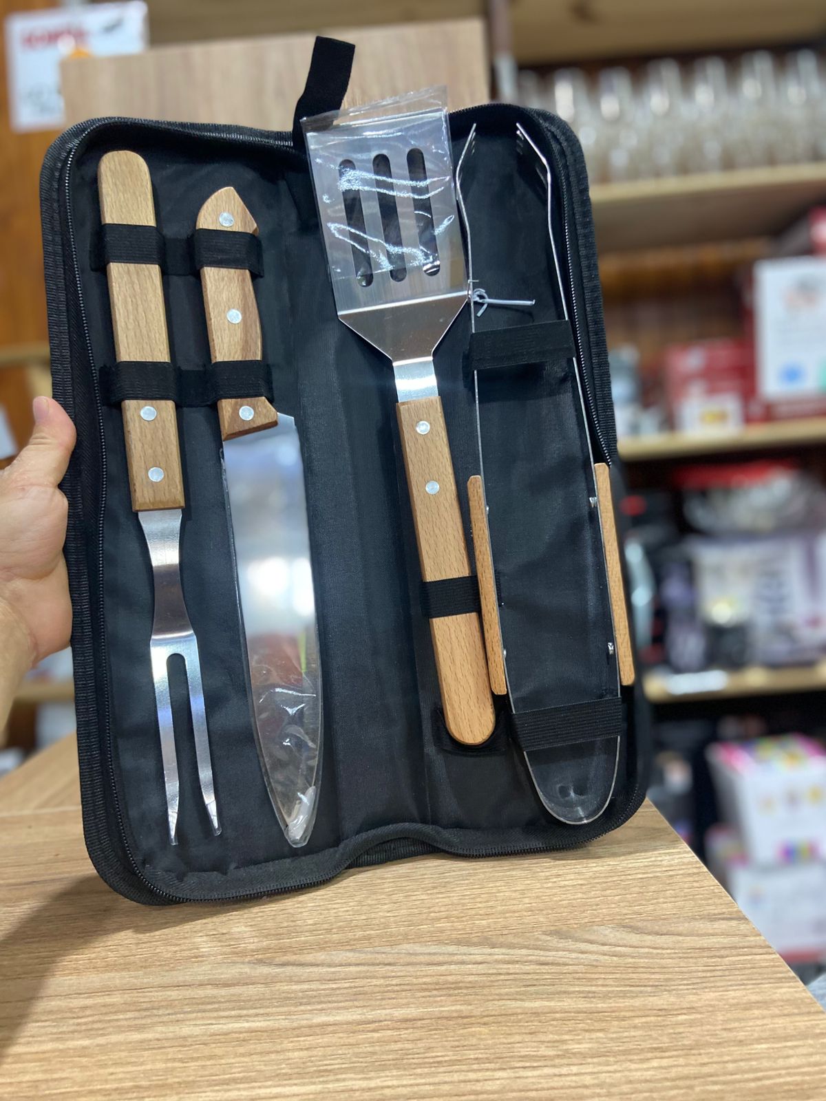 Set asadero X4 PCS de alta calidad. Incluye 4 piezas esenciales para asados y un estuche con cierre para organizarlas y transportarlas fácilmente.