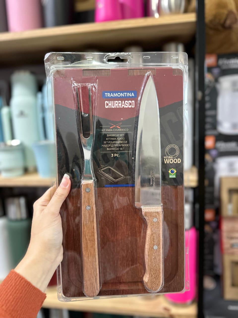 Set asador Tramontina con tabla de madera. Ideal para asar y servir carnes, pescados y verduras. Perfecto para barbacoas y reuniones familiares. Alta calidad y durabilidad.