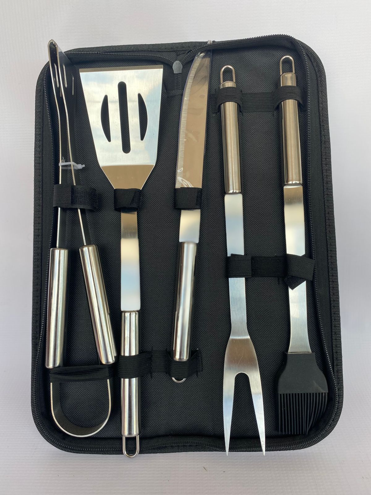 Set de asador de 5 piezas en metal con estuche. Ideal para barbacoas, parrillas y cocina al aire libre. Duradero y completo.